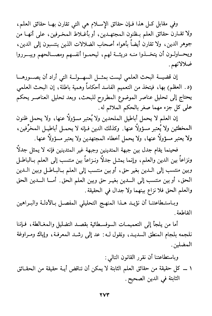 وفي مقابل كل هذا فإن حقائق الإسلام هي التي تقارن بها حقائق العلم، ولا تقارن حقائق العلم بظنون المجتهدين، أو بأغلاط المخرفين، على أنها من جوهر الدين، ولا تقارن أيضاً بأهواء أصحاب الضلالات الذين ينتسبون إلى الدين، ويحاولون أن يتخذوا منه دريئة لهم، ليحموا أنفسهم ومصالحهم ويبرروا ضلالاتهم.