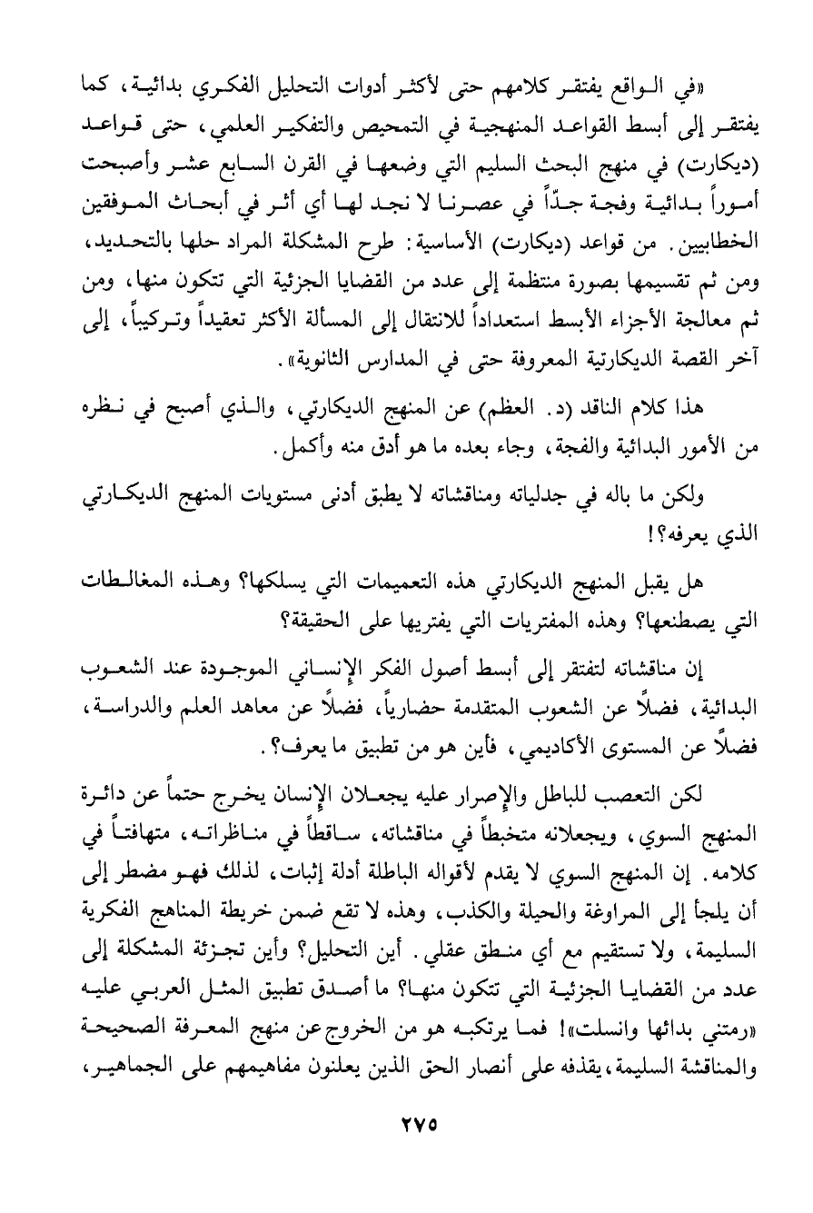 هل يقبل المنهج الديكارتي هذه التعميمات التي يسلكها؟ وهذه المغالطات التي يصطنعها؟ وهذه المفتريات التي يفتريها على الحقيقة؟