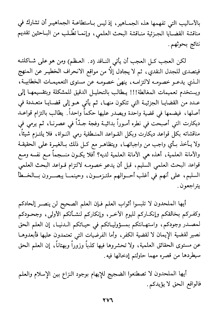 لكن العجب كل العجب أن يأتي الناقد (د. العظم) ومن هو على شاكلته فيتصدى للجدل النقدي، ثم لا يجادل إلا من مواقع الانحراف الخطير عن المنهج الذي يدعو خصومه لالتزامه، ينهي خصومه عن مستوى التعميمات الخطابية، ويستخدم تعميمات المغالطة!!! يطالب بالتحليل الدقيق للمشكلة وبتقسيمها إلى عدد من القضايا الجزئية التي تتكون منها، ثم يأتي هو إلى قضايا متعددة في أصلها، فيضمها في قضية واحدة ويصدر عليها حكماً واحداً. يطالب بالتزام قواعد ديكارت التي أصبحت في نطره أموراً بدائية وفجة جداً في عرنا، ثم يرمي في مناقشاته بكل قواعد ديكارت وبكل القواعد المنطقية رمي النواة، فلا يلتزم شيئاً، ولا يأخذ بأي واجب من واجباتها، ويتظاهر مع كل ذلك بالغيرة على الحقيقة والأمانة العلمية، أهذه هي الأمانة العلمية لديه؟ أفلا يكون منسجماً مع نفسه ومع قواعد البحث العلمي السليم، قبل أن يدعو خصومه لالتزام قواعد البحث العلمي السليم، على أنهم في أغلب أحوالهم ملتزمون، وحينما يبصرون بالخطأ يتراجعون.
