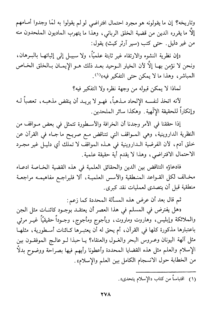 وتاريخه؟ إن ما يقولونه هو مجرد احتمال افتراضي لو لم يقولوا به لما وجدوا أمامهم إلا ما يقرره الدين من قضية الخلق الرباني، وهذا ما يتهرب الماديون الملحدون منه من غير دليل. حتى كتب (سير آرثر كيث) يقول: