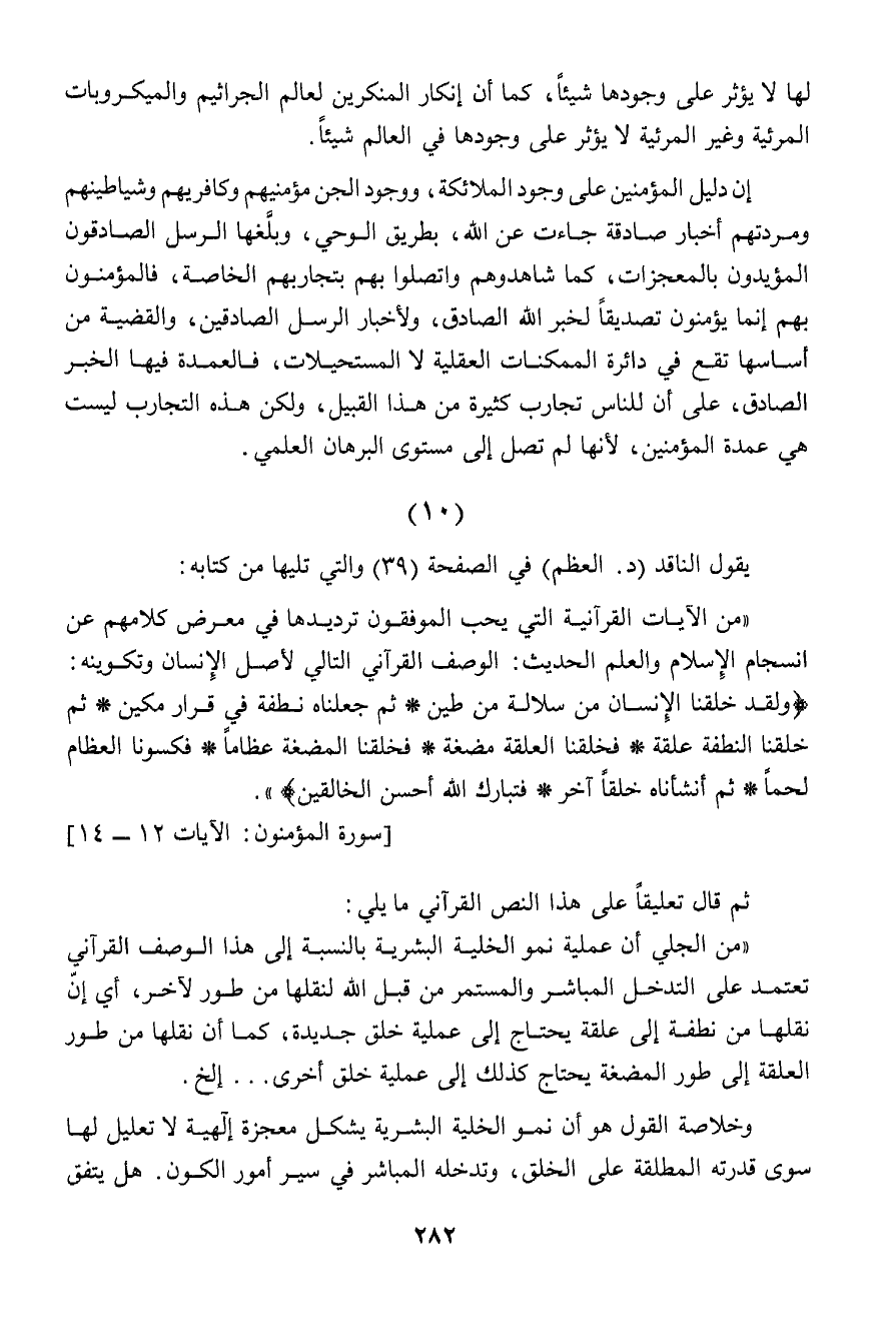 "من الجلي أن عملية نمو الخلية البشرية بالنسبة إلى هذا الوصف القرآني تعتمد على التدخل المباشر والمستمر من قبل الله لنقلها من طور آخر، أي إن نقلها من نطفة إلى علقة يحتاج إلى عملية خلق جديدة، كما أن نقلها من طور العلقة إلى طور المضغة يحتاج كذلك إلى عملية خلق أخرى ... إلخ.
