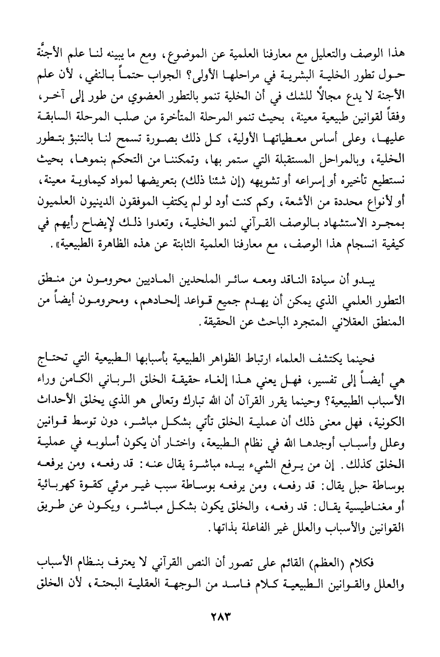 فكلام (العظم) القائم على تصور أن النص القرآني لا يعترف بنظام الأسباب والعلل والقونين الطبيعية كلام فاسد من الوجهة العقلية البحتة، لأن الخلق