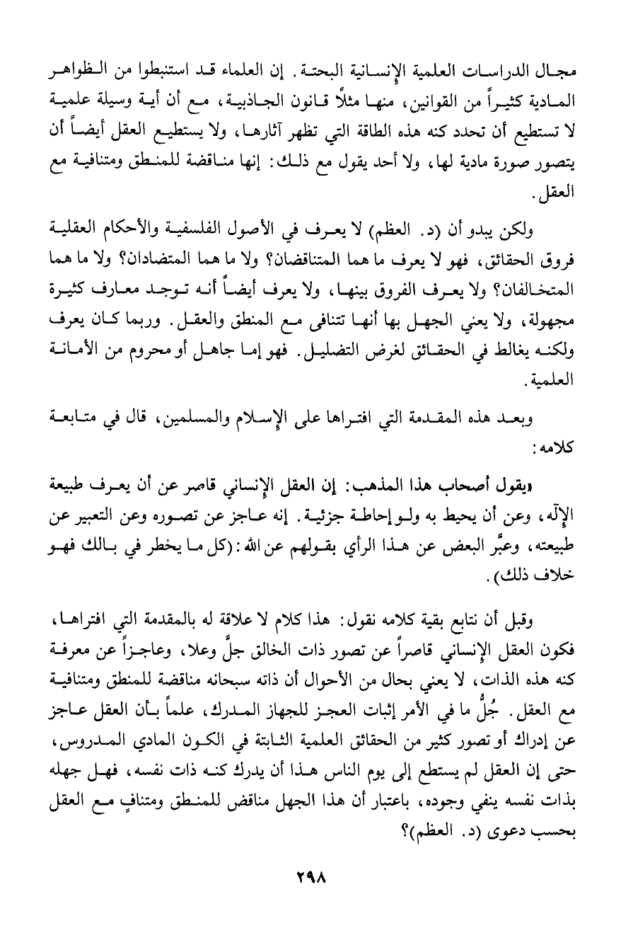 مجال الدراسات العلمية الإنسانية البحتة. إن العلماء قد استنبطوا من الظواهر المادية كثيراً من القوانين، منها مثلاً قانون الجاذبية، مع أن أية وسيلة علمية لا تستطيع أن تحدد كنه هذه الطاقة التي تظهر آثارها، ولا يستطيع العقل أيضاً أن يتصور صورة مادية لها، ولا أحد يقول مع ذلك: إنها مناقضة للمنطق ومتنافية مع العقل.