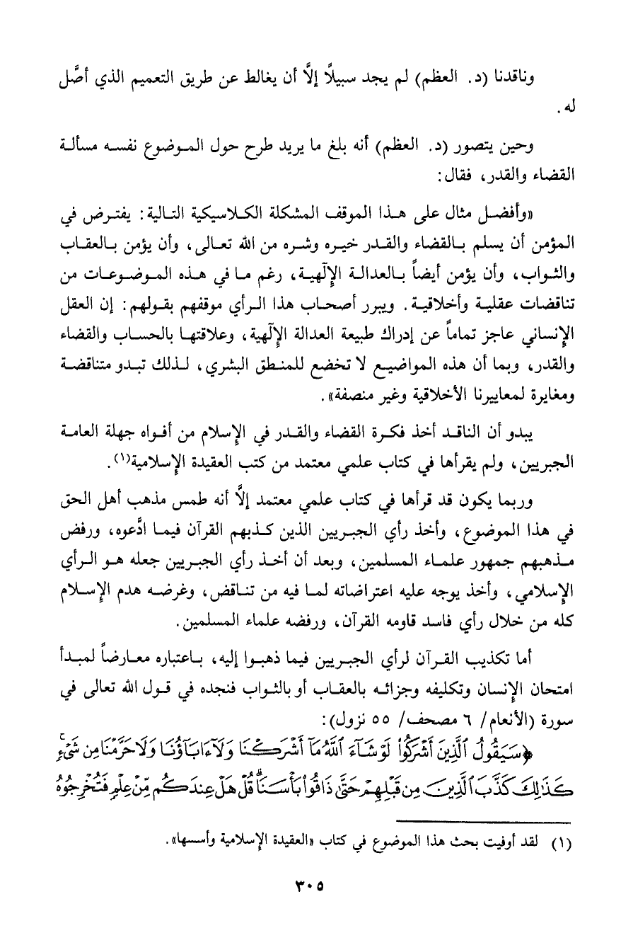 وحين يتصور (د. العظم) أنه بلغ ما يريد طرح حول الموضوع نفسه مسألة القضاء والقدر، فقال: