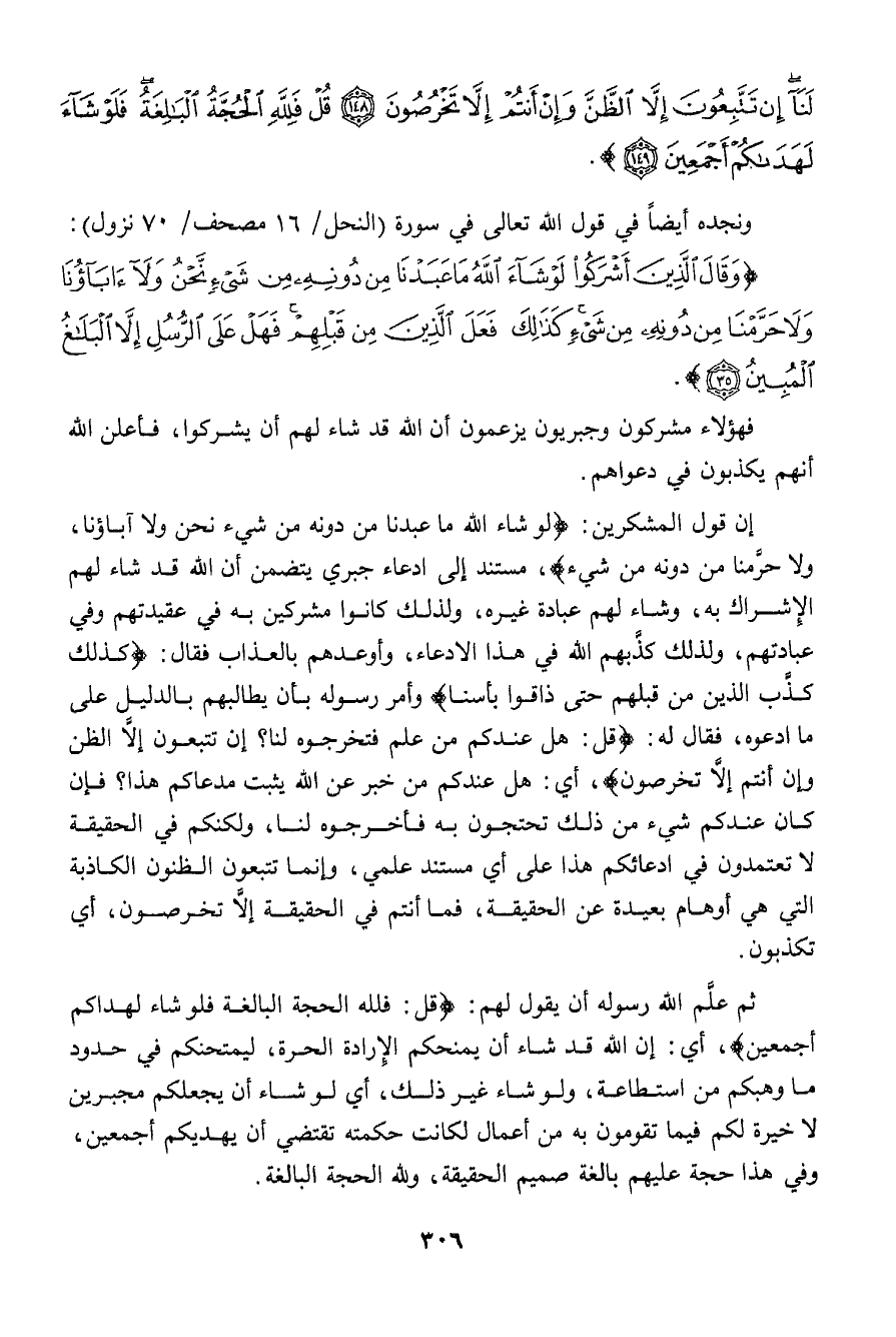 {وَقَالَ الَّذِينَ أَشْرَكُواْ لَوْ شَآءَ اللَّهُ مَا عَبَدْنَا مِن دُونِهِ مِن شَيْءٍ نَّحْنُ وَلا? آبَاؤُنَا وَلاَ حَرَّمْنَا مِن دُونِهِ مِن شَيْءٍ كَذالِكَ فَعَلَ الَّذِينَ مِن قَبْلِهِمْ فَهَلْ عَلَى الرُّسُلِ إِلاَّ الْبَلاغُ الْمُبِينُ}