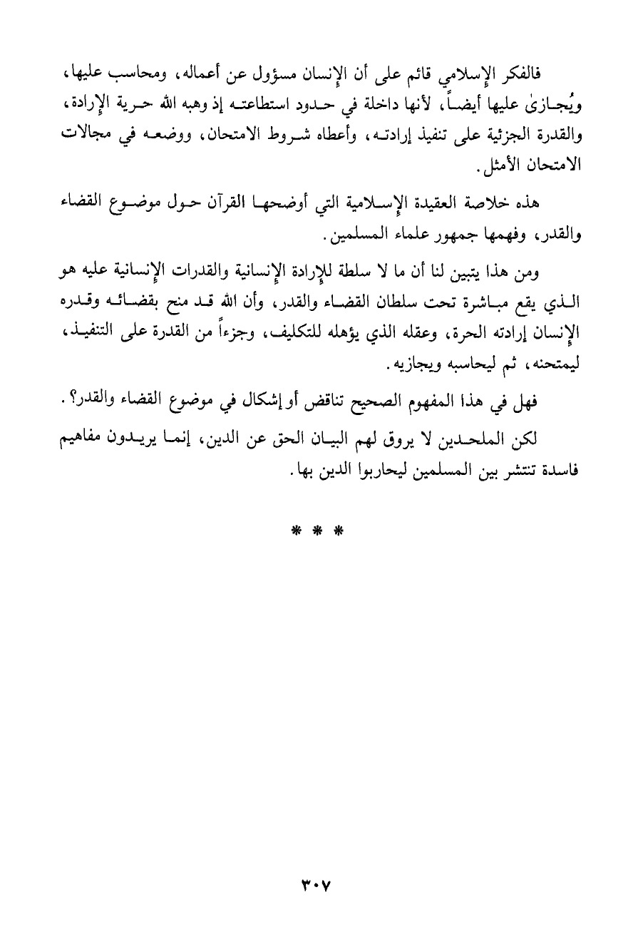 هذه خلاصة العقيدة الإسلامية التي أوضحها القرآن حول موضوع القضاء والقدر، وفهمها جمهور علماء المسلمين.