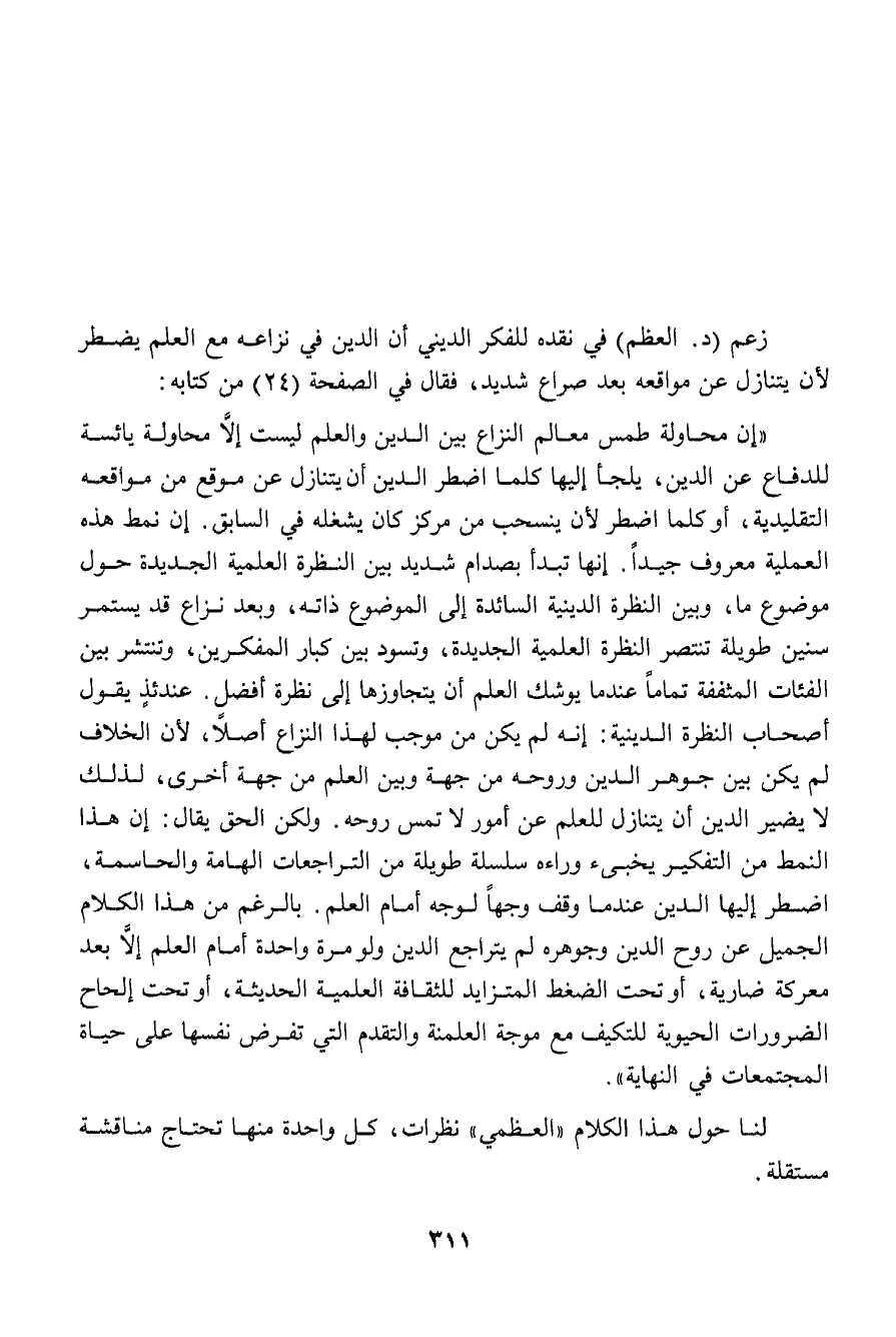 زعم (د. العظم) في نقده للفكر الديني أن الدين في نزاعه مع العلم يضطر لأن يتنازل عن مواقعه بعد صراع شديد، فقال في الصفحة (24) من كتابه: