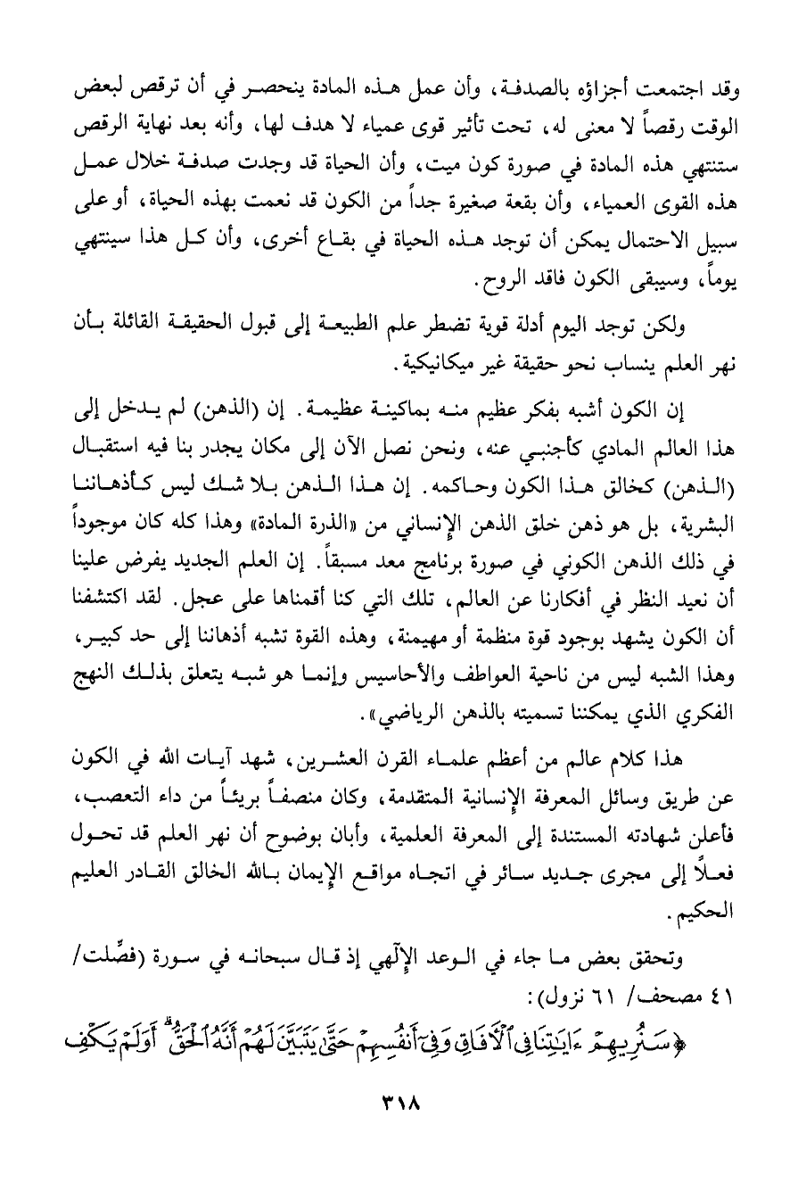 وقد اجتمعت أجزاؤه بالصدفة، وأن عمل هذه المادة ينحصر في أن ترقص لبعض الوقت رقصاً لا معنى له، تحت تأثير قوى عمياء لا هدف لها، وأنه بعد نهاية الرقص ستنتهي هذه المادة في صورة كون ميت، وأن الحياة قد وجدت صدفة خلال عمل هذه القوى العمياء، وأن بقعة صغيرة جداً من الكون قد نعمت بهذه الحياة، أو على سبيل الاحتمال يمكن أن توجد هذه الحياة في بقاع أخرى، وأن كل هذا سينتهي يوماً، وسيبقى الكون فاقد الروح.