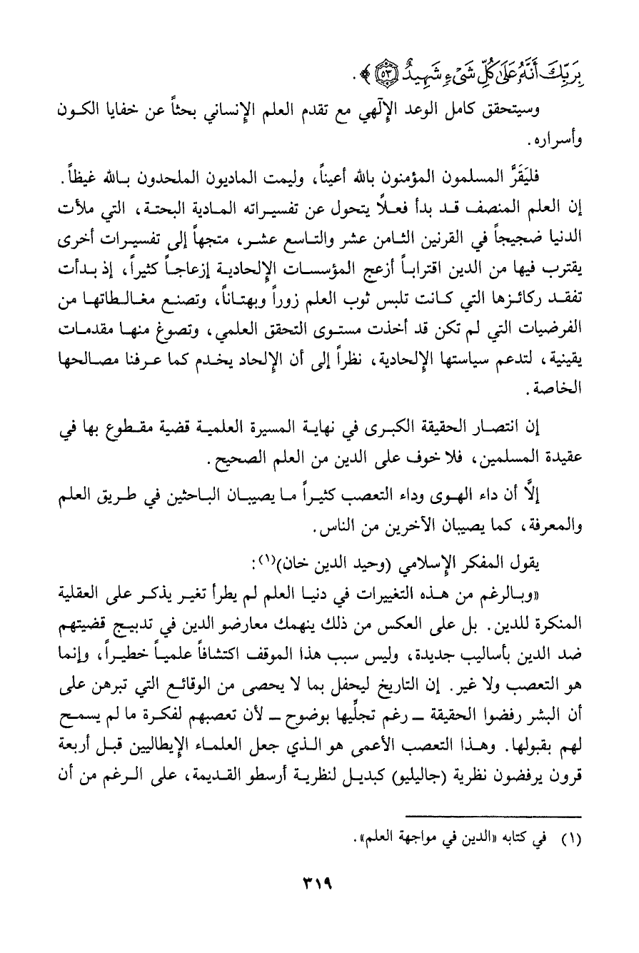 "وبالرغم من هذه التغييرات في دنيا العلم لم يطرأ تغير يذكر على العقلية المنكرة للدين. بل على العكس من ذلك ينهمك معارضو الدين في تدبيج قضيتهم ضد الدين بأساليب جديدة، وليس سبب هذا الموقف اكتشافاً علمياً خطيراً، وإنما هو التعصب ولا غير. إن التاريخ ليحفل بما لا يحصى من الوقائع التي تبرهن على أن البشر رفضوا الحقيقة - رغم تجليها بوضوح - لأن تعصبهم لفكرة ما لم يسمح لهم بقبولها. وهذا التعصب الأعمى هو الذي جعل العلماء الإيطاليين قبل أربعة قرون يرفضون نظرية (جاليليو) كبديل لنظرية أرسطو القديمة، على الرغم من أن