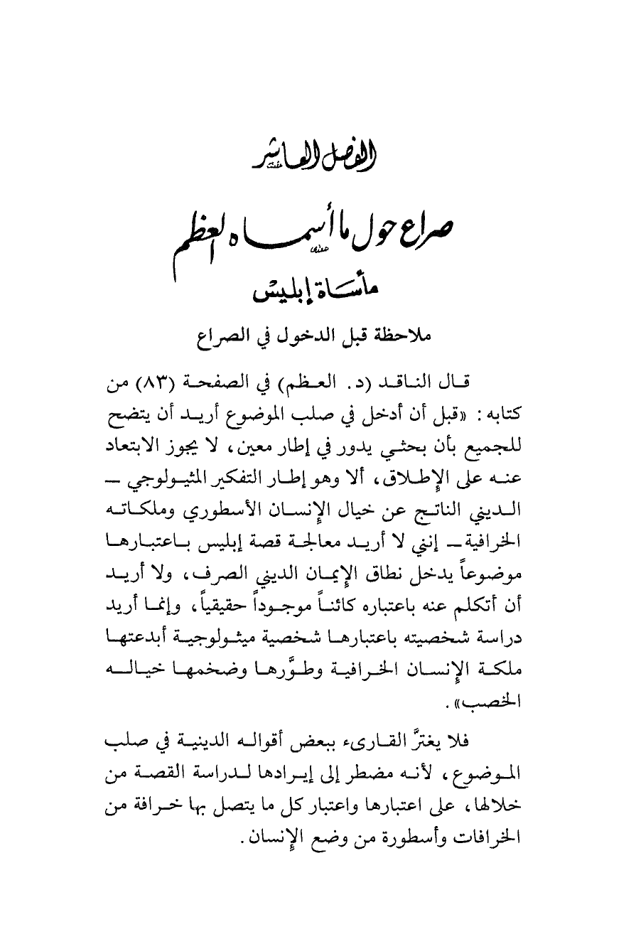 قال الناقد (د. العظم) في الصفحة (83) من كتابه: "قبل أن أدخل في صلب الموضوع أريد أن يتضح للجميع بأن بحثي يدور في إطار معين، لا يجوز الابتعاد عنه على الإطلاق، ألا وهو إطار التفكير المثيولوجي - الديني الناتج عن خيال الإنسان الأسطوري وملكاته الخرافية - إنني لا أريد معالجة قصة إبليس باعتبارها موضوعاً يدخل نطاق الإيمان الديني الصرف، ولا أريد أن أتكلم عنه باعتباره كائناً موجوداً حقيقياً، وإنما أريد دراسة شخصيته باعتبارها شخصية ميثولوجية أبدعتها ملكة الإنسان الخرافية وطوَّرها وضخمها خياله الخصب".