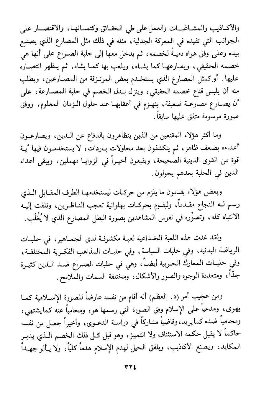 ومن عجيب أمر (د. العظم) أنه أقام من نفسه عارضاً للصورة الإسلامية كما يهوى، ومدعياً على الإسلام وفق الصورة التي رسمها هو، ومحامياً عنه كما يشتهي، ومحامياً ضده كما يريد، وقاضياً مشاركاً في دراسة الدعوى، وأخيراً جعل من نفسه حاكماً لا يقبل حكمه الاستئناف ولا التمييز، وهو قبل كل ذلك الخصم الذي يدبر المكايد، ويصنع الأكاذيب، ويلفق الحيل لهدم الإسلام هدماً كلياً، ولا يألوا جهداً