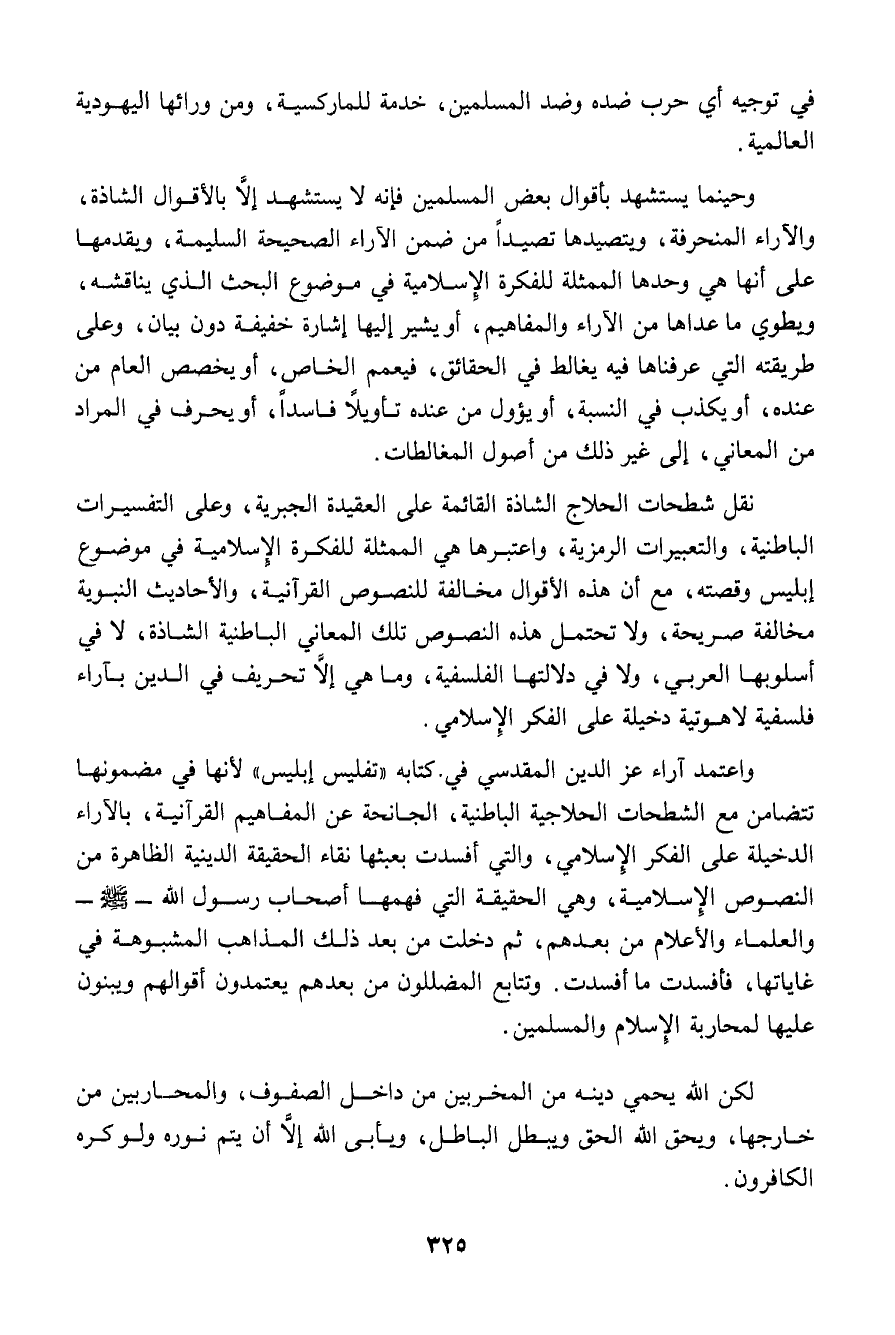 واعتمد آراء عز الدين المقدسي في كتابه "تفليس إبليس" لأنها في مضمونها تتضامن مع الشطحات الحلاجية الباطنية، الجانحة عن المفاهيم القرآنية، بالآراء الدخيلة على الفكر الإسلامي، والتي أفسدت بعبثها نقاء الحقيقة الدينية الظاهرة من النصوص الإسلامية، وهي الحقيقة التي فهمها أصحاب رسول الله - صلى الله عليه وسلم - والعلماء والأعلام من بعدهم، ثم دخلت من بعد ذلك المذاهب المشبوهة في غاياتها، فأفسدت ما أفسدت. وتتابع المضللون من بعدهم يعتمدون أقوالهم ويبنون عليها لمحاربة الإسلام والمسلمين.
