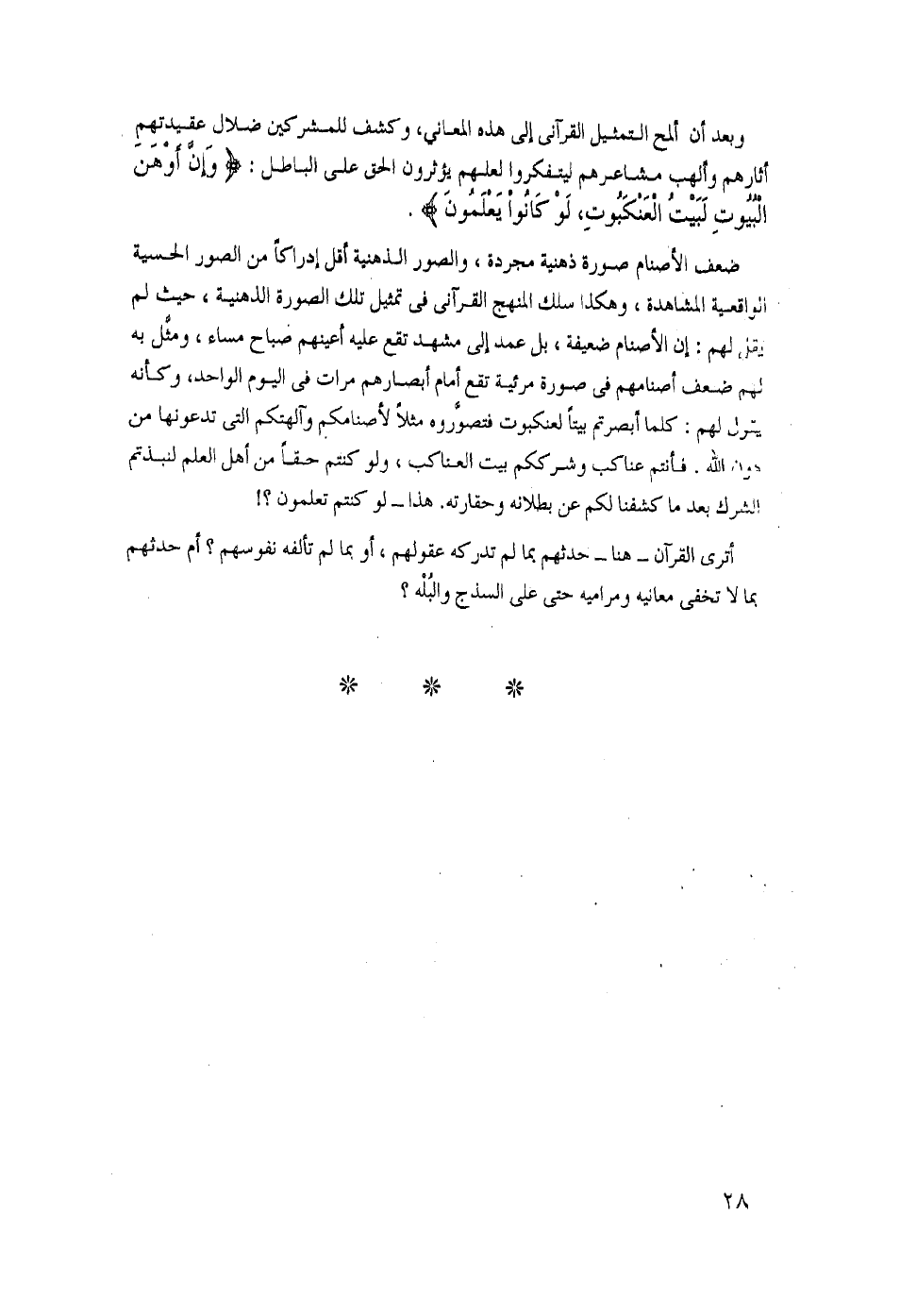 ضعف الأصنام صورة ذهنية مجردة، والصور الذهنية أقا إدراكاً من الصور الحسية الواقعية المشاهدة، وهكذا سلك المنهج القرآني في تمثيل تلك الصورة الذهنية، حيث لم يقل لهم: إن الأصنام ضعيفة، بل عمد إلى مشهد تقع عليه أعينهم صباح مساء، ومثَّل به لهم ضعف أصنامهم في صورة مرئية تقع أمام أبصارهم مرات في اليوم الواحد، وكأنه يقول لهم: كلما أبصرتم بيتاً لعنكبوت فتصوَّره مثلاً لأصنامكم وآلهتكم التي تدعونها من دون الله، فأنتهم عناكب وشرككم بيت العناكب، ولو كنتم حقاً من أهل العلم لبنبذتم الشرك بعد ما كشفنا لكم عن بطلانه وحقارته. هذا - لو كنتم تعلمون؟!