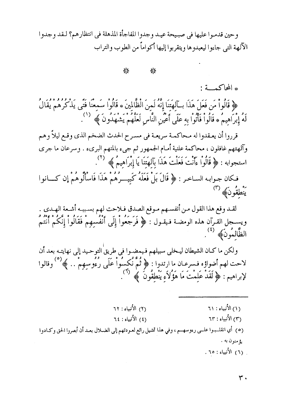 قرورا أن يعقدوا له محاكمة سريعة في مسرح الحدث الضخم الذي وقع ليلاً وهم وآلهتهم غافلون، محاكمة علنية أمام الجمهور ثم جئ بالمتهم البرئ. وسرعان ما جرى استجوابه: {قَالُوا أَأَنْتَ فَعَلْتَ هَذَا بِآلِهَتِنَا يَا إِبْرَاهِيمُ} .