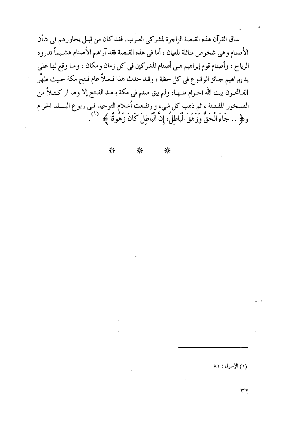 ساق القرآن هذه القصة الزاجرة لمشركي العرب. فقد كان من قبل يحاورهم في شأن الأصنام وهي شخوص ماثلة للعيان، أما في هذه القصة فقد آراهم الأصنام هشيماً تذروه الرياح، وأصنام قوم إبراهيم هي أصنام المشركين في كل زمان ومكان، وما وقع لها على يد إبراهيم جائز الوقوع في كل لحظة، وقد حدث هذا فعلاً عام فتح مكة حيث طهَّر الفاتحون بيت الله الحرام منها، ولم يبق صنم في مكة بعد الفتح إلا وصار كتلاً من الصخور المفتتة، ثم ذهب كل شيء وارتفعت أعلام التوحيد في ربوع البلد الحرام و {.... جَاءَ الْحَقُّ وَزَهَقَ الْبَاطِلُ إِنَّ الْبَاطِلَ كَانَ زَهُوقًا} .