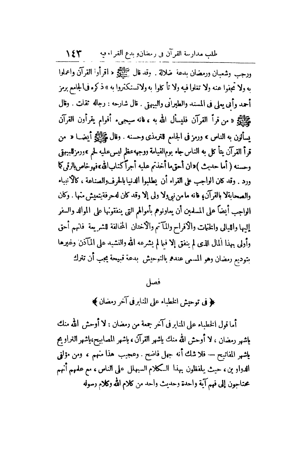أَيَّام الْجُمُعَات على المنابر فِي دواوين الخطباء الجاهلون الغافلون عَن صَحِيح الحَدِيث وسقيمه، فطالبوهم أَيهَا النَّاس أَن لَا يقرأوا عَلَيْكُم إِلَّا الصَّحِيح. وحرقوا مَا بِأَيْدِيهِم من دواوين فَهِيَ سَبَب ضلالتكم وضياع دينكُمْ ودنياكم قُولُوا لَهُم اقرأوا علينا الْقُرْآن على المنابر وَإِلَّا فانزلوا وَإِذا كذبُوا على رَسُول الله على المنابر فَلَا تتسمحوا بهم إِذا نزلُوا وَلَكِن ابصقوا فِي أَعينهم.