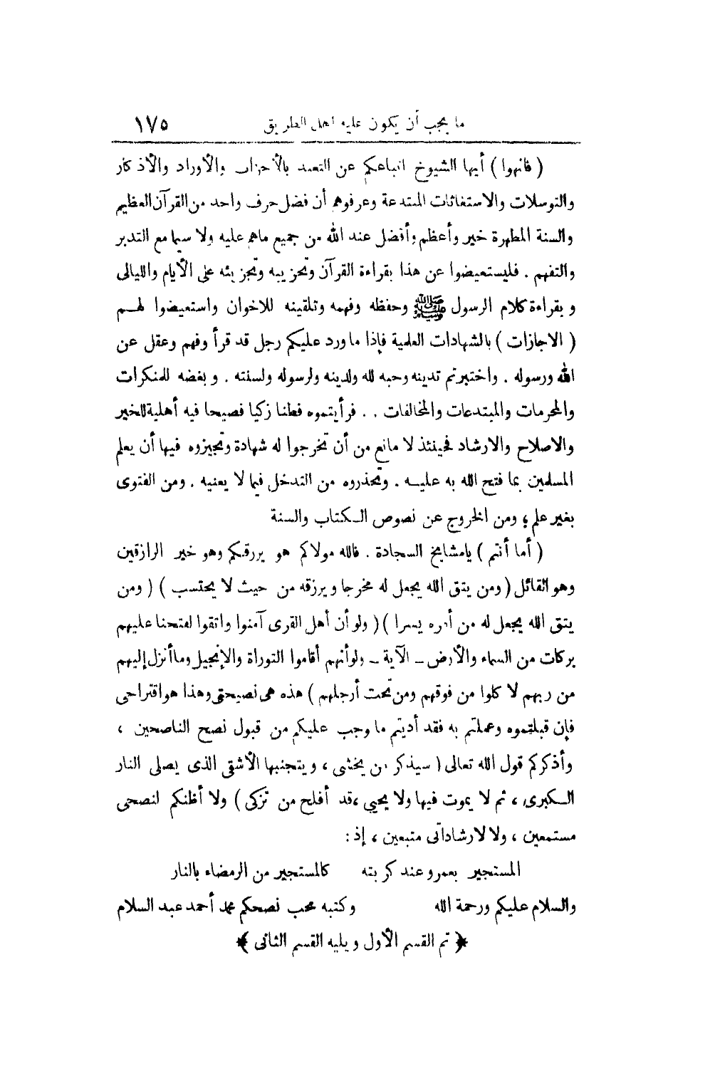 والرفاعي والدسوقي، والبيومي، والإمبابي، ومولد النَّبِي. وَمَا من بلد من من بِلَاد الْمُسلمين إِلَّا وفيهَا مقدسون، ومعظمون من الْأَمْوَات يذبحون وينذرون لَهُم، ويتقربون إِلَيْهِم بنفائس النذور والذبائح الَّتِي هِيَ حق لله وَحده لَا شريك لَهُ، ف {أُولَئِكَ الَّذين ضل سَعْيهمْ فِي الْحَيَاة الدُّنْيَا وهم يحسبون أَنهم يحسنون صنعا} ، فَمَا بِهَذَا أَمركُم الله فِي كِتَابه أَيهَا الْمُسلمُونَ، بل أَمر الله نبيه أَن يَقُول: {قل إِن صَلَاتي ونسكي ومحياي ومماتي لله رب الْعَالمين لَا شريك لَهُ وَبِذَلِك أمرت وَأَنا أول الْمُسلمين} ، فَالله تَعَالَى يَأْمر نبيه أَن يخبر الْمُشْركين الَّذين يعْبدُونَ غير الله ويذبحون لغيره، أَنه مُخَالف لَهُم فِي ذَلِك وَأَن صلواته وقرباته، وعبادته وذبائحه لله وَحده لَا شريك لَهُ، وَقد قَالَ الله تَعَالَى أَيْضا لَهُ ( [صلى الله عَلَيْهِ وَسلم] ) : {فصل لِرَبِّك وانحر} أَي أخْلص لَهُ صَلَاتك وذبحك، فَإِن الْمُشْركين يعْبدُونَ الْأَوْلِيَاء والموتى، ويذبحون لَهَا، فَلَا تفعل كفعلهم وَهَذَا كَقَوْلِه تَعَالَى: {فَمن كَانَ يَرْجُو لِقَاء ربه فليعمل عملا صَالحا وَلَا يُشْرك بِعبَادة ربه أحدا} .