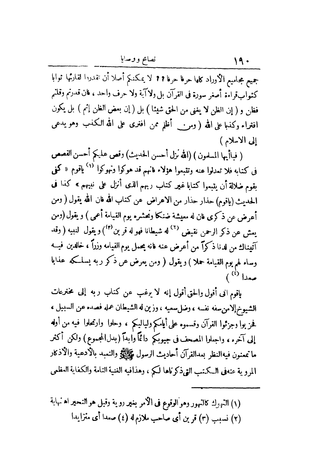 أَعرضُوا عَن كِتَابه الْمُبين الَّذِي فصلت آيَاته، ويسره الله للذّكر، وَعَن سنَن نبيه الَّذِي أُوتِيَ جَوَامِع الْكَلم، وهديه خير الْهدى، مَعَ أَن عباد الْأَوْثَان والأصنام - ود وسواع ويغوث ويعوق ونسر وَاللات والعزى - لما عرفُوا هَذَا الدّين الْقيم وآمنوا بِهِ وَاتبعُوا نبيه صَار إِيمَان الْوَاحِد مِنْهُم لَو وزن بِإِيمَان أهل الأَرْض جَمِيعًا لرجح عَلَيْهِ، واهتز عرش الرَّحْمَن لمَوْت أحدهم أَلا وَهُوَ سعد بن معَاذ، وَلَقَد كَانُوا يفادون نَبِي الله بِأَمْوَالِهِمْ وأنفسهم، ويناجونه بقَوْلهمْ بِأبي أَنْت وَأمي يَا رَسُول الله. وأقسموا بِاللَّه جهد أَيْمَانهم أَن رَسُول الله [صلى الله عَلَيْهِ وَسلم] أحب إِلَيْهِم من أَمْوَالهم وَأَوْلَادهمْ حَتَّى من أنفسهم الَّتِي بَين جنُوبهم، وَصَدقُوا وَالله. وَعمر لما جَاءَهُ الرجل يتحاكم إِلَيْهِ بعد مَا حكم لَهُ النَّبِي [صلى الله عَلَيْهِ وَسلم] ضرب عُنُقه، وَكَانُوا على مَا اشْتهر من الْجفَاء وَالْقَسْوَة فَصَارَت أَخْلَاقهم الْقُرْآن وَالسّنة، ومرجعهم فِي جَمِيع أَحْوَالهم إِلَى الْقُرْآن وَالسّنة، ووعظهم وإرشادهم بِالْقُرْآنِ وَالسّنة، وَكَانُوا لَا يعلمُونَ أَبْنَاءَهُم ونساءهم وَلَا يحاجون طوائف الزيغ والضلالة، إِلَّا بِالْقُرْآنِ وَالسّنة، فدينهم الَّذِي بِهِ يدينون، وللتفقه فِيهِ ليل نَهَار يجاهدون، وللحياة وَالْمَوْت عَلَيْهِ يتمنون، إِنَّمَا هُوَ الْكتاب وَالسّنة، فَمَا سادوا وساسوا النَّاس جَمِيعًا، وملكوا ممالك مَشَارِق الأَرْض وَمَغَارِبهَا إِلَّا بِهَذَيْنِ الثقلَيْن الْكتاب وَالسّنة. وخاب وربي وخسر قوم عَنْهُمَا عمون، وبغيرهما يتمسكون ويشتغلون، وَمن يرغب عَن خطة مُحَمَّد الَّتِي ارتسمها إِلَّا من سفه، وضل سَعْيه وَلعب بِهِ شَيْطَانه، فصده عَن الصِّرَاط الْمُسْتَقيم.