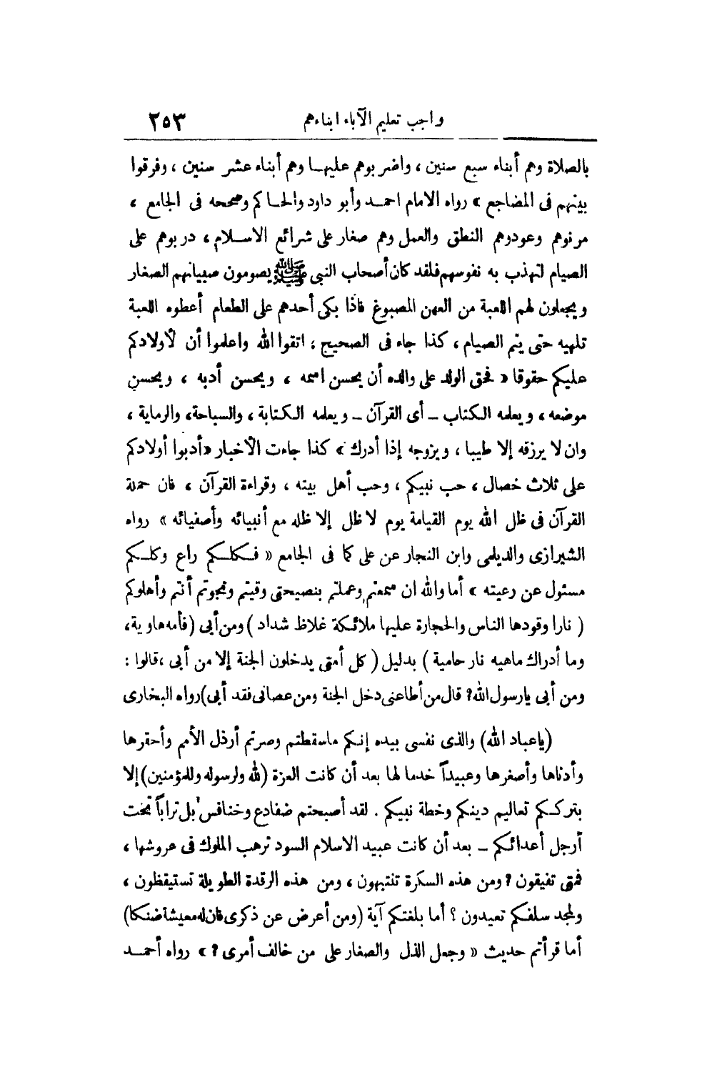 أَصْبَحْنَا وَبِك أمسينا، وَبِك نحيا، وَبِك نموت وَإِلَيْك النشور وَإِذا أَمْسَى فَلْيقل: اللَّهُمَّ بك أمسينا وَبِك أَصْبَحْنَا، وَبِك نحيا، وَبِك نموت، إِلَيْك الْمصير " قَالَ التِّرْمِذِيّ: حَدِيث حسن صَحِيح، وَفِي صَحِيح البُخَارِيّ عَن شَدَّاد بن أَوْس عَن النَّبِي [صلى الله عَلَيْهِ وَسلم] قَالَ " سيد الاسْتِغْفَار اللَّهُمَّ أَنْت رَبِّي لَا إِلَه إِلَّا أَنْت، خلقتني وَأَنا عَبدك، وَأَنا على عَهْدك وَوَعدك مَا اسْتَطَعْت، أعوذ بك من شَرّ مَا صنعت، أَبُوء لَك بنعمتك عَليّ وأبوء بذنبي، فَاغْفِر لي فَإِنَّهُ لَا يغْفر الذُّنُوب إِلَّا أَنْت، من قَالَهَا حِين يُمْسِي فَمَاتَ من ليلته دخل الْجنَّة، وَمن قَالَهَا حِين يصبح فَمَاتَ من يَوْمه دخل الْجنَّة "، وَفِي التِّرْمِذِيّ عَن أبي هُرَيْرَة أَن أَبَا بكر الصّديق قَالَ لرَسُول الله [صلى الله عَلَيْهِ وَسلم] : مرني بِشَيْء أقوله إِذا أَصبَحت وَإِذا أمسيت، قَالَ: " قل اللَّهُمَّ عَالم الْغَيْب وَالشَّهَادَة، فاطر السَّمَوَات وَالْأَرْض رب كل شَيْء ومليكه، أشهد أَن لَا إِلَه إِلَّا أَنْت، أعوذ بك من شَرّ نَفسِي وَشر الشَّيْطَان وشركه، وَأَن نقترف سوءا على أَنْفُسنَا أَو نجره إِلَى مُسلم، قله إِذا أَصبَحت وَإِذا أمسيت، وَإِذا أخذت مضجعك " قَالَ التِّرْمِذِيّ حَدِيث حسن صَحِيح، وَفِي التِّرْمِذِيّ أَيْضا عَن عُثْمَان بن عَفَّان قَالَ: قَالَ رَسُول الله [صلى الله عَلَيْهِ وَسلم] " مَا من عبد يَقُول فِي صباح كل يَوْم وَمَسَاء كل لَيْلَة بِسم الله الَّذِي لَا يضر مَعَ اسْمه شَيْء فِي الأَرْض وَلَا فِي السَّمَاء وَهُوَ السَّمِيع الْعَلِيم ثَلَاث مَرَّات - فيضره شَيْء " قَالَ التِّرْمِذِيّ: حَدِيث حسن وَفِيه أَيْضا عَن ثَوْبَان وَغَيره أَن رَسُول الله [صلى الله عَلَيْهِ وَسلم] قَالَ: من قَالَ حِين يمسى وَإِذا أصبح، رضيت بِاللَّه رَبًّا، وَبِالْإِسْلَامِ دينا، وَبِمُحَمَّدٍ [صلى الله عَلَيْهِ وَسلم] نَبيا كَانَ حَقًا على الله أَن يرضيه " وَقَالَ: حَدِيث حسن صَحِيح، وَفِي التِّرْمِذِيّ أَيْضا عَن أنس أَن رَسُول الله