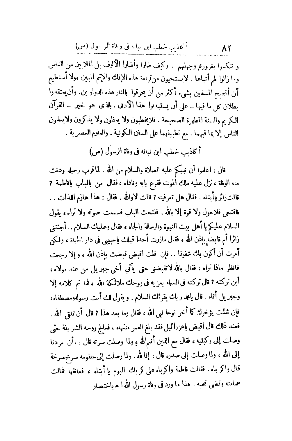 يَقُول الْمُؤلف مُحَمَّد بن أَحْمد مُحَمَّد عبد السَّلَام عَفا الله عَنهُ وَغفر لَهُ ورحمه قد قَالَ الله سُبْحَانَهُ فِي الْقُرْآن الْمجِيد فِي حق الشُّهَدَاء: {وَلَا تحسبن الَّذين قتلوا فِي سَبِيل الله أَمْوَاتًا بل أَحيَاء عِنْد رَبهم يرْزقُونَ فرحين بِمَا آتَاهُم الله من فَضله ويستبشرون بالذين لم يلْحقُوا بهم من خَلفهم أَلا خوف عَلَيْهِم وَلَا هم يَحْزَنُونَ} . فالشهداء أَحيَاء عِنْد رَبهم حَيَاة برزخية، لَا نعلم نَحن حَقِيقَتهَا، وَالله وَحده يعلمهَا وهم فَرِحُونَ بِمَا هم فِيهِ من النِّعْمَة، ويستبشرون بإخوانهم الَّذين يقتلُون بعدهمْ فِي سَبِيل الله، ويلحقون بهم وَأَنَّهُمْ جَمِيعًا لَا يخَافُونَ وَلَا يَحْزَنُونَ إِذا خَافَ وحزن النَّاس، اللَّهُمَّ ألحقنا بهم شُهَدَاء فِي سَبِيل إعلاء كلمتك، وَسنة نبيك آمين، فَإِذا كَانَ هَذَا فِيمَن اتبعُوا النَّبِي الْكَرِيم، فَكيف تكون كَرَامَة هَذَا الرَّسُول الْأَعْظَم سيد الْأَنْبِيَاء وَالْمُرْسلِينَ، وبل وَسيد ولد آدم أَجْمَعِينَ؟