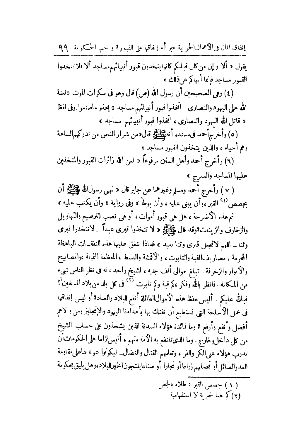 وَلَقَد حضر لدي بَعضهم، وَكَانُوا مسافرين أميالاً وبرداً فَأَمَرتهمْ بِالْقصرِ فَأَبَوا، فأسفت وَقلت: إِنَّا لله وَإِنَّا إِلَيْهِ رَاجِعُون! وَمَا وَقع مِنْهُم ذَلِك إِلَّا لأَنهم فِي الْهدى النَّبَوِيّ مفرطون ومقصرون، وَعَن اقتناء كتب السّنة وعَلى الْأَقَل البُخَارِيّ وَمُسلم غافلون، بل لكتب الْحَوَاشِي والشروح يجمعُونَ، وفيهَا يذاكرون، وَكَانُوا إِذا ذَهَبُوا إِلَى الشَّيْخ رَحمَه الله فِي أَيَّام الْجُمُعَات فَلَيْسَ لَهُم هم إِلَّا أَنهم ليده يقبلُونَ، وبثيابه يتمسحون، وَقد نبهتكم يَا إخْوَانِي لحبي فِيكُم فعساكم تتنبهون وتتفقهون، وبالسنة تَعْمَلُونَ.