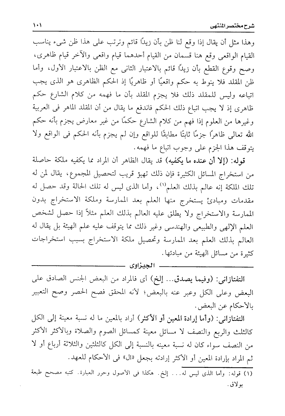 التفتازانى: (وفيما يصدق. . . إلخ) أى فالمراد من البعض الجنس الصادق على البعض وعلى الكل وعبر عنه بالبعض؛ لأنه المحقق فصح الحصر وصح التعبير بالأحكام عن البعض.
