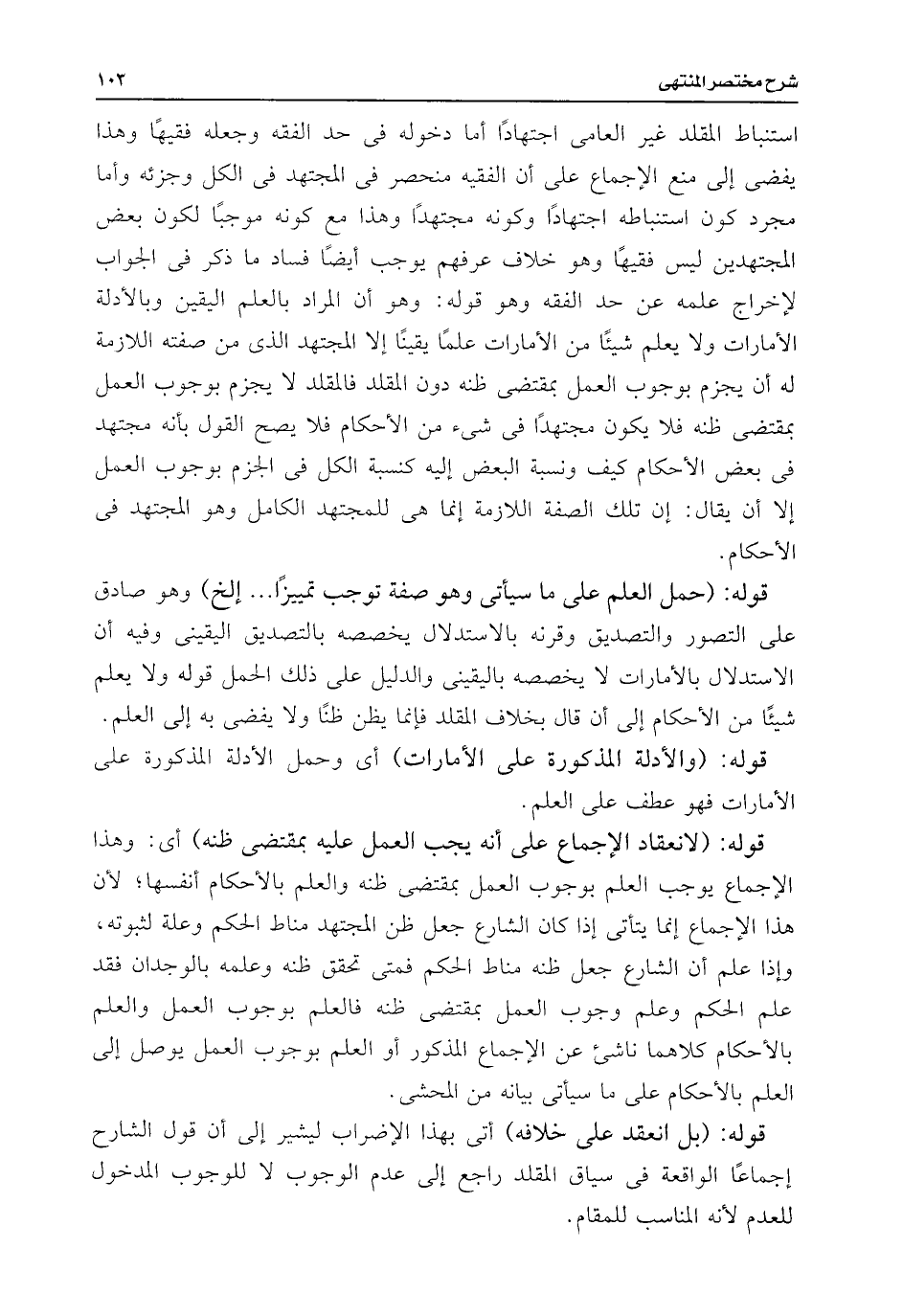 استنباط المقلد غير العامى اجتهادًا أما دخوله فى حد الفقه وجعله فقيهًا وهذا يفضى إلى منع الإجماع على أن الفقيه منحصر فى المجتهد فى الكل وجزئه وأما مجرد كون استنباطه اجتهادًا وكونه مجتهدًا وهذا مع كونه موجبًا لكون بعض المجتهدين ليس فقيهًا وهو خلاف عرفهم يوجب أيضًا فساد ما ذكر فى الجواب لإخراج علمه عن حد الفقه وهو قوله: وهو أن المراد بالعلم اليقين وبالأدلة الأمارات ولا يعلم شيئًا من الأمارات علمًا يقينًا إلا المجتهد الذى من صفته اللازمة له أن يجزم بوجوب العمل بمقتضى ظنه دون المقلد فالمقلد لا يجزم بوجوب العمل بمقتضى ظنه فلا يكون مجتهدًا فى شئ عن الأحكام فلا يصح القول بأنه مجتهد فى بعض الأحكام كيف ونسبة البعض إليه كنسبة الكل فى الجزم بوجوب العمل إلا أن يقال: إن تلك الصفة اللازمة إنما هى للمجتهد الكامل وهو المجتهد فى الأحكام.