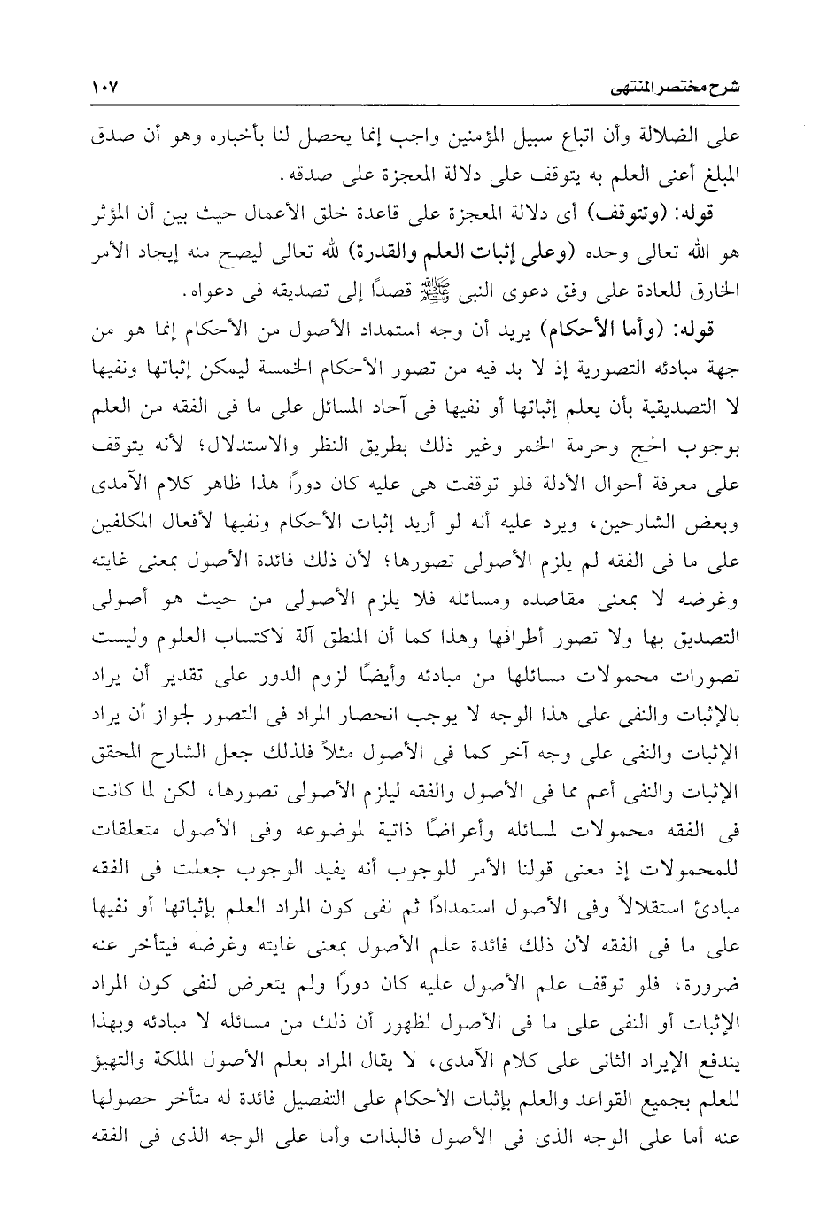 قوله: (وأما الأحكام) يريد أن وجه استمداد الأصول من الأحكام إنما هو من جهة مبادئه التصورية إذ لا بد فيه من تصور الأحكام الخمسة ليمكن إثباتها ونفيها لا التصديقية بأن يعلم إثباتها أو نفيها فى آحاد المسائل على ما فى الفقه من العلم بوجوب الحج وحرمة الخمر وغير ذلك بطريق النظر والاستدلال؛ لأنه يتوقف على معرفة أحوال الأدلة فلو توقفت هى عليه كان دورًا هذا ظاهر كلام الآمدى وبعض الشارحين، ويرد عليه أنه لو أريد إثبات الأحكام ونفيها لأفعال المكلفين على ما فى الفقه لم يلزم الأصولى تصورها؛ لأن ذلك فائدة الأصول بمعنى غايته وغرضه لا بمعنى مقاصده ومسائله فلا يلزم الأصولى من حيث هو أصولى التصديق بها ولا تصور أطرافها وهذا كما أن المنطق آلة لاكتساب العلوم وليست تصورات محمولات مسائلها من مبادئه وأيضًا لزوم الدور على تقدير أن يراد بالإثبات والنفى على هذا الوجه لا يوجب انحصار المراد فى التصور لجواز أن يراد الإثبات والنفى على وجه آخر كما فى الأصول مثلًا فلذلك جعل الشارح المحقق الإثبات والنفى أعم مما فى الأصول والفقه ليلزم الأصولى تصورها، لكن لما كانت فى الشقه محمولات لمسائله وأعراضًا ذاتية لموضوعه وفى الأصول متعلقات للمحمولات إذ معنى قولنا الأمر للوجوب أنه يفيد الوجوب جعلت فى الفقه مبادئ استقلالًا وفى الأصول استمدادًا ثم نفى كون المراد العلم بإثباتها أو نفيها على ما فى الفقه لأن ذلك فائدة علم الأصول بمعنى غايته وغرضه فيتأخر عنه ضرورة، فلو توقف علم الأصول عليه كان دورًا ولم يتعرض لنفى كون المراد الإثبات أو النفى على ما فى الأصول لظهور أن ذلك من مسائله لا مبادئه وبهذا يندفع الإيراد الثانى على كلام الآمدى، لا يقال المراد بعلم الأصول الملكة والتهيؤ للعلم بجميع القواعد والعلم بإثبات الأحكام على التفصيل فائدة له متأخر حصولها عنه أما على الوجه الذى فى الأصول فالبذات وأما على الوجه الذى فى الفقه
