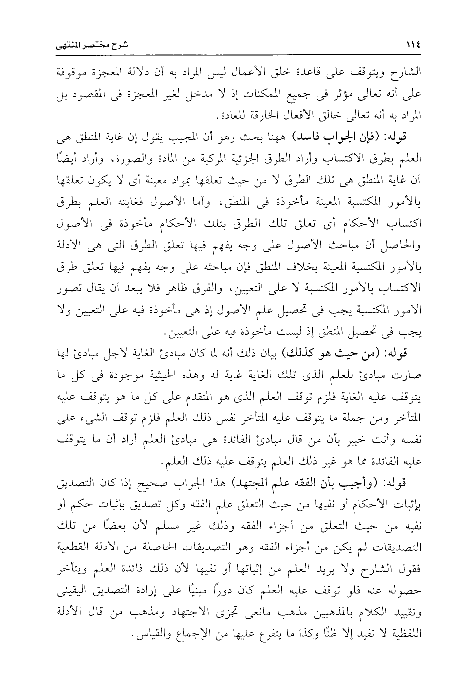 قوله: (فإن الجواب فاسد) ههنا بحث وهو أن المجيب يقول إن غاية المنطق هى العلم بطرق الاكتساب وأراد الطرق الجزئية المركبة من المادة والصورة، وأراد أيضًا أن غاية المنطق هى تلك الطرق لا من حيث تعلقها بمواد معينة أى لا يكون تعلقها بالأمور المكتسبة المعينة مأخوذة فى المنطق، وأما الأصول فغايته العلم بطرق اكتساب الأحكام أى تعلق تلك الطرق بتلك الأحكام مأخوذة فى الأصول والحاصل أن مباحث الأصول على وجه يفهم فيها تعلق الطرق التى هى الأدلة بالأمور المكتسبة العينة بخلاف المنطق فإن مباحثه على وجه يفهم فيها تعلق طرق الاكتساب بالأمور المكتسبة لا على التعيين، والفرق ظاهر فلا يبعد أن يقال تصور الأمور المكتسبة يجب فى تحصيل علم الأصول إذ هى مأخوذة فيه على التعيين ولا يجب فى تحصيل المنطق إذ ليست مأخوذة فيه على التعيين.