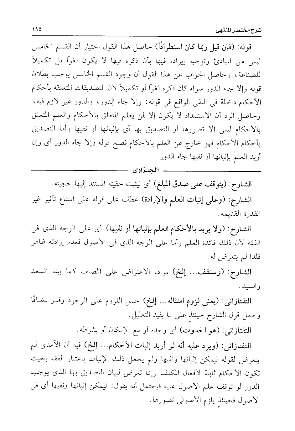 قوله: (فإن قيل ربما كان استطرادًا) حاصل هذا القول اختيار أن القسم الخامس ليس من المبادئ وتوجيه إيراده فيها بأن ذكره فيها لا يكون لغوًا بل تكميلًا للصناعة، وحاصل الجواب عن هذا القول أن وجود القسم الخامس يوجب بطلان قوله وإلا جاء الدور سواء كان ذكره لغوًا أو تكميلًا لأن التصديقات المتعلقة بأحكام الأحكام داخلة فى النفى الواقع فى قوله: وإلا جاء الدور، والدور غير لازم فيه، وحاصل الرد أن الاستمداد لا يكون إلا لمن يعلم المتعلق بالأحكام والعلم المتعلق بالأحكام ليس إلا تصورها أو التصديق بها أى بإثباتها أو نفيها وأما التصديق بأحكام الأحكام فهو خارج عن العلم بالأحكام فصح قوله وإلا جاء الدور أى وإن أريد العلم بإثباتها أو نفيها جاء الدور.