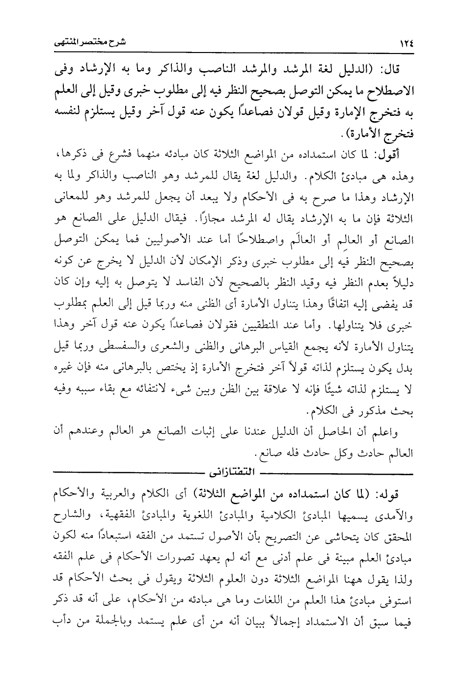 أقول: لما كان استمداده من المواضع الثلاثة كان مبادئه منهما فشرع فى ذكرها، وهذه هى مبادئ الكلام. والدليل لغة يقال للمرشد وهو الناصب والذاكر ولما به الإرشاد وهذا ما صرح به فى الأحكام ولا يبعد أن يجعل للمرشد وهو للمعانى الثلاثة فإن ما به الإرشاد يقال له المرشد مجازًا. فيقال الدليل على الصانع هو الصانع أو العالِم أو العالَم واصطلاحًا أيضًا عند الأصوليين فما يمكن التوصل بصحيح النظر فيه إلى مطلوب خبرى وذكر الإمكان لأن الدليل لا يخرج عن كونه دليلًا بعدم النظر فيه وقيد النظر بالصحيح لأن الفاسد لا يتوصل به إليه وإن كان قد يفضى إليه اتفاقًا وهذا يتناول الأمارة أى الظنى منه وربما قيل إلى العلم بمطلوب خبرى فلا يتناولها. وأما عند المنطقيين فقولان فصاعدًا يكون عنه قول آخر وهذا يتناول الأمارة لأنه يجمع القياس البرهانى والظنى والشعرى والسفسطى وربما قيل بدل يكون يستلزم لذاته قولًا آخر فتخرج الأمارة إذ يختص بالبرهانى منه فإن غيره لا يستلزم لذاته شيئًا فإنه لا علاقة بين الظن وبين شئ لانتفائه مع بقاء سببه وفيه بحث مذكور فى الكلام.