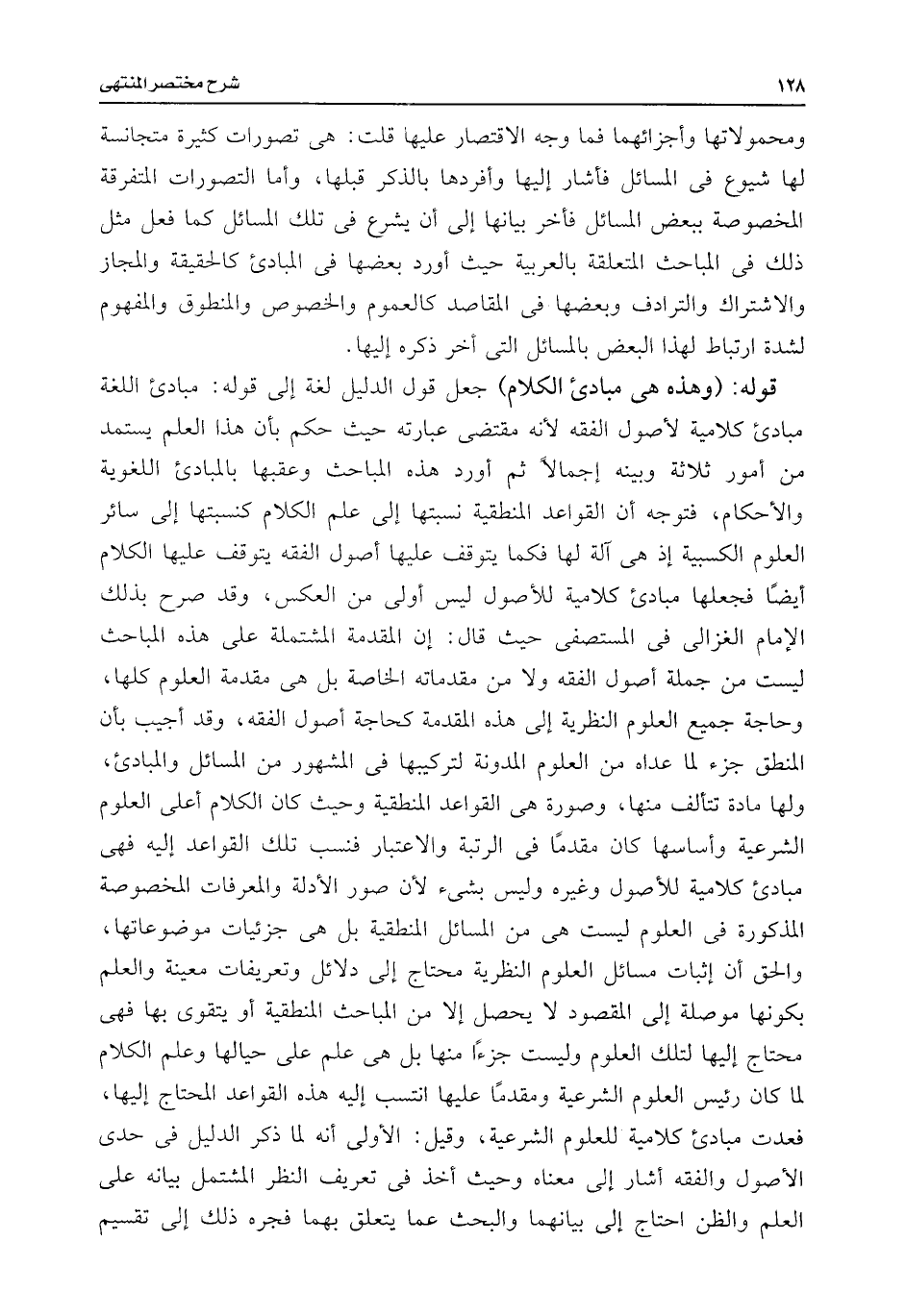 قوله: (وهذه هى مبادئ الكلام) جعل قول الدليل لغة إلى قوله: مبادئ اللغة مبادئ كلامية لأصول الفقه لأنه مقتضى عبارته حيث حكم بأن هذا العلم يستمد من أمور ثلاثة وبينه إجمالًا ثم أورد هذه المباحث وعقبها بالمبادئ اللغوية والأحكام، فتوجه أن القواعد المنطقية نسبتها إلى علم الكلام كنسبتها إلى سائر العلوم الكسبية إذ هى آلة لها فكما يتوقف عليها أصول الفقه يتوقف عليها الكلام أيضًا فجعلها مبادئ كلامية للأصول ليس أولى من العكس، وقد صرح بذلك الإمام الغزالى فى المستصفى حيث قال: إن المقدمة المشتملة على هذه المباحث ليست من جملة أصول الفقه ولا من مقدماته الخاصة بل هى مقدمة العلوم كلها، وحاجة جميع العلوم النظرية إلى هذه المقدمة كحاجة أصول الفقه، وقد أجيب بأن المنطق جزء لما عداه من العلوم المدونة لتركيبها فى المشهور من المسائل والمبادئ، ولها مادة تتألف منها، وصورة هى القواعد المنطقية وحيث كان الكلام أعلى العلوم الشرعية وأساسها كان مقدمًا فى الرتبة والاعتبار فنسب تلك القواعد إليه فهى مبادئ كلامية للأصول وغيره وليس بشئ لأن صور الأدلة والمعرفات المخصوصة المذكورة فى العلوم ليست هى من المسائل المنطقية بل هى جزئيات موضوعاتها، والحق أن إثبات مسائل العلوم النظرية محتاج إلى دلائل وتعريفات معينة والعلم بكونها موصلة إلى المقصود لا يحصل إلا من المباحث المنطقية أو يتقوى بها فهى محتاج إليها لتلك العلوم وليست جزءًا منها بل هى علم على حيالها وعلم الكلام لما كان رئيس العلوم الشرعية ومقدمًا عليها انتسب إليه هذه القواعد المحتاج إليها، فعدت مبادئ كلامية للعلوم الشرعية، وقيل: الأولى أنه لما ذكر الدليل فى حدى الأصول والفقه أشار إلى معناه وحيث أخذ فى تعريف النظر المشتمل بيانه على العلم والظن احتاج إلى بيانهما والبحث عما يتعلق بهما فجره ذلك إلى تقسيم