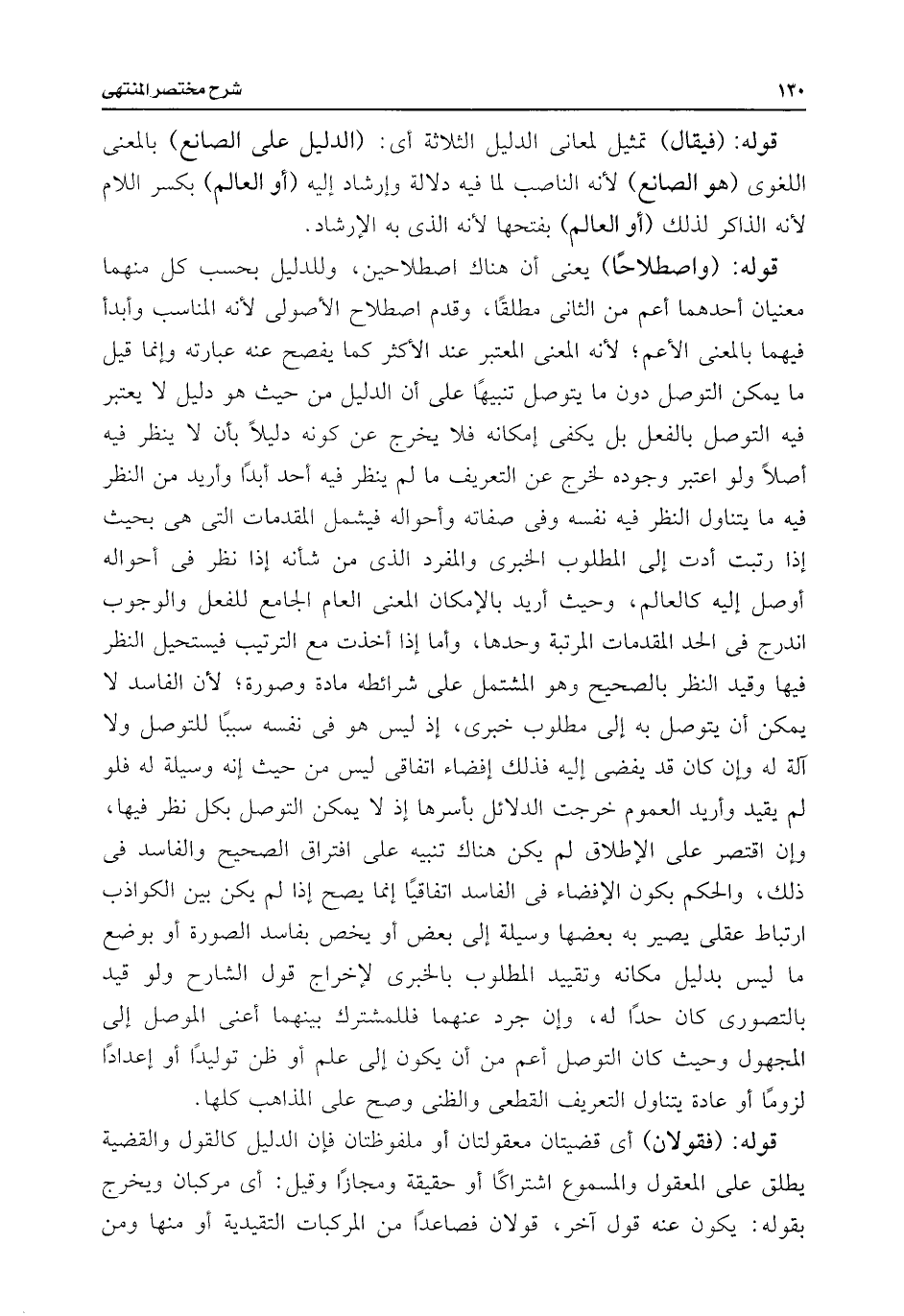 قوله: (واصطلاحًا) يعنى أن هناك اصطالاحين، وللدليل بحسب كل منهما معنيان أحدهما أعم من الثانى مطلقًا، وقدم اصطلاح الأصولى لأنه المناسب وأبدأ فيهما بالمعنى الأعم؛ لأنه المعنى المعتبر عند الأكثر كما يفصح عنه عبارته وإنما قيل ما يمكن التوصل دون ما يتوصل تنبيهًا على أن الدليل من حيث هو دليل لا يعتبر فيه التوصل بالفعل بل يكفى إمكانه فلا يخرج عن كونه دليلًا بأن لا ينظر فيه أصلًا ولو اعتبر وجوده لخرج عن التعريف ما لم ينظر منه أحد أبدًا وأريد من النظر فيه ما يتناول النظر فيه نفسه وفى صفاته وأحواله فيشمل المقدمات التى هى بحيث إذا رتبت أن إلى المطلوب الخبرى والمفرد الذى من شأنه إذا نظر فى أحواله أوصل إليه كالعالم، وحيث أريد بالإمكان المعنى العام الجامع للفعل والوجوب اندرج فى الحد المقدمات المرتبة وحدها، وأما إذا أخذت مع الترتيب فيستحيل النظر فيها وقيد النظر بالصحيح وهو المشتمل على شرائطه مادة وصورة؛ لأن الفاسد لا يمكن أن يتوصل به إلى مطلوب خبرى، إذ ليس هو فى نفسه سببًا للتوصل ولا آلة له وإن كان قد يفضى إليه فذلك إفضاء اتفاقى ليس من حيث إنه وسيلة له فلو لم يقيد وأريد العموم خرجت الدلائل بأسرها إذ لا يمكن التوصل بكل نظر فيها، وإن اقتصر على الإطلاق لم يكن هناك تنبيه على افتراق الصحيح والفاسد فى ذلك، والحكم يكون الإفضاء فى الفاسد اتفاقيًا إنما يصح إذا لم يكن بين الكواذب ارتباط عقلى يصير به بعضها وسيلة إلى بعض أو يخص بفاسد الصورة أو بوضع ما ليس بدليل مكانه وتقييد المطلوب بالخبرى لإخراج قول الشارح ولو قيد بالتصورى كان حدًا له، وإن جرد عنهما فللمشترك بينهما أعنى الموصل إلى المجهول وحيث كان التوصل أعم من أن يكون إلى علم أو ظن توليدًا أو إعدادًا لزومًا أو عادة يتناول التعريف القطعى والظنى وصح على المذاهب كلها.