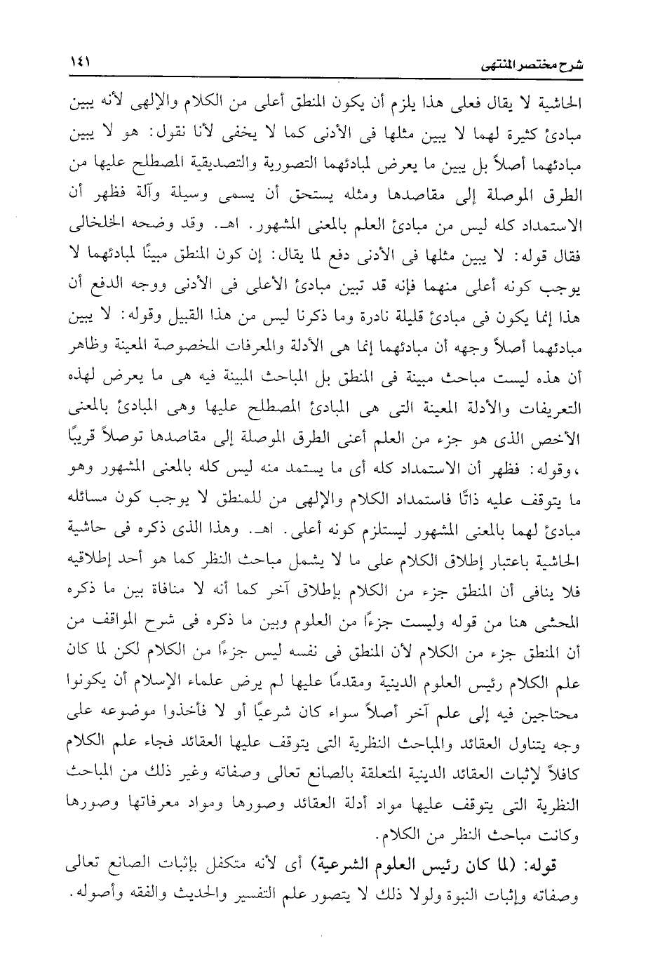 الحاشية لا يقال فعلى هذا يلزم أن يكون المنطق أعلى من الكلام والإلهى لأنه يبين مبادئ كثيرة لهما لا يبين مثلها فى الأدنى كما لا يخفى لأنا نقول: هو لا يبين مبادئهما أصلًا بل يبين ما يعرض لمبادئهما التصورية والتصديقية المصطلح عليها من الطرق الموصلة إلى مقاصدها ومثله يستحق أن يسمى وسيلة وآلة فظهر أن الاستمداد كله ليس من مبادئ العلم بالمعنى المشهور. اهـ. وقد وضحه الخلخالى فقال قوله: لا يبين مثلها فى الأدنى دفع لما يقال: إن كون المنطق مبينًا لمبادئهما لا يوجب كونه أعلى منهما فإنه قد تبين مبادئ الأعلى فى الأدنى ووجه الدفع أن هذا إنما يكون فى مبادئ قليلة نادرة وما ذكرنا ليس من هذا القبيل وقوله: لا يبين مبادئهما أصلًا وجهه أن مبادئهما إنما هى الأدلة والمعرفات المخصوصة المعينة وظاهر أن هذه ليست مباحث مبينة فى المنطق بل المباحث المبينة فيه هى ما يعرض لهذه التعريفات والأدلة المعينة التى هى المبادئ المصطلح عليها وهى المبادئ بالمعنى الأخص الذى هو جزء من العلم أعنى الطرق الموصلة إلى مقاصدها توصلًا قريبًا، وقوله: فظهر أن الاستمداد كله أى ما يستمد منه ليس كله بالمعنى المشهور وهو ما يتوقف عليه ذاتًا فاستمداد الكلام والإلهى من للمنطق لا يوجب كون مسائله مبادئ لهما بالمعنى المشهور ليستلزم كونه أعلى. اهـ. وهذا الذى ذكره فى حاشية الحاشية باعتبار إطلاق الكلام على ما لا يشمل مباحث النظر كما هو أحد إطلاقيه فلا ينافى أن المنطق جزء من الكلام بإطلاق آخر كما أنه لا منافاة بين ما ذكره المحشى هنا من قوله وليست جزءًا من العلوم وبين ما ذكره فى شرح المواقف من أن المنطق جزء من الكلام لأن المنطق فى نفسه ليس جزءًا من الكلام لكن لما كان علم الكلام رئيس العلوم الدينية ومقدمًا عليها لم يرض علماء الإسلام أن يكونوا محتاجين فيه إلى علم آخر أصلًا سواء كان شرعيًا أو لا فأخذوا موضوعه على وجه يتناول العقائد والمباحث النظرية التى يتوقف عليها العقائد فجاء علم الكلام كافلًا لإثبات العقائد الدينية المتعلقة بالصانع تعالى وصفاته وغير ذلك من المباحث النظرية التى يتوقف عليها مواد أدلة العقائد وصورها ومواد معرفاتها وصورها وكانت مباحث النظر من الكلام.