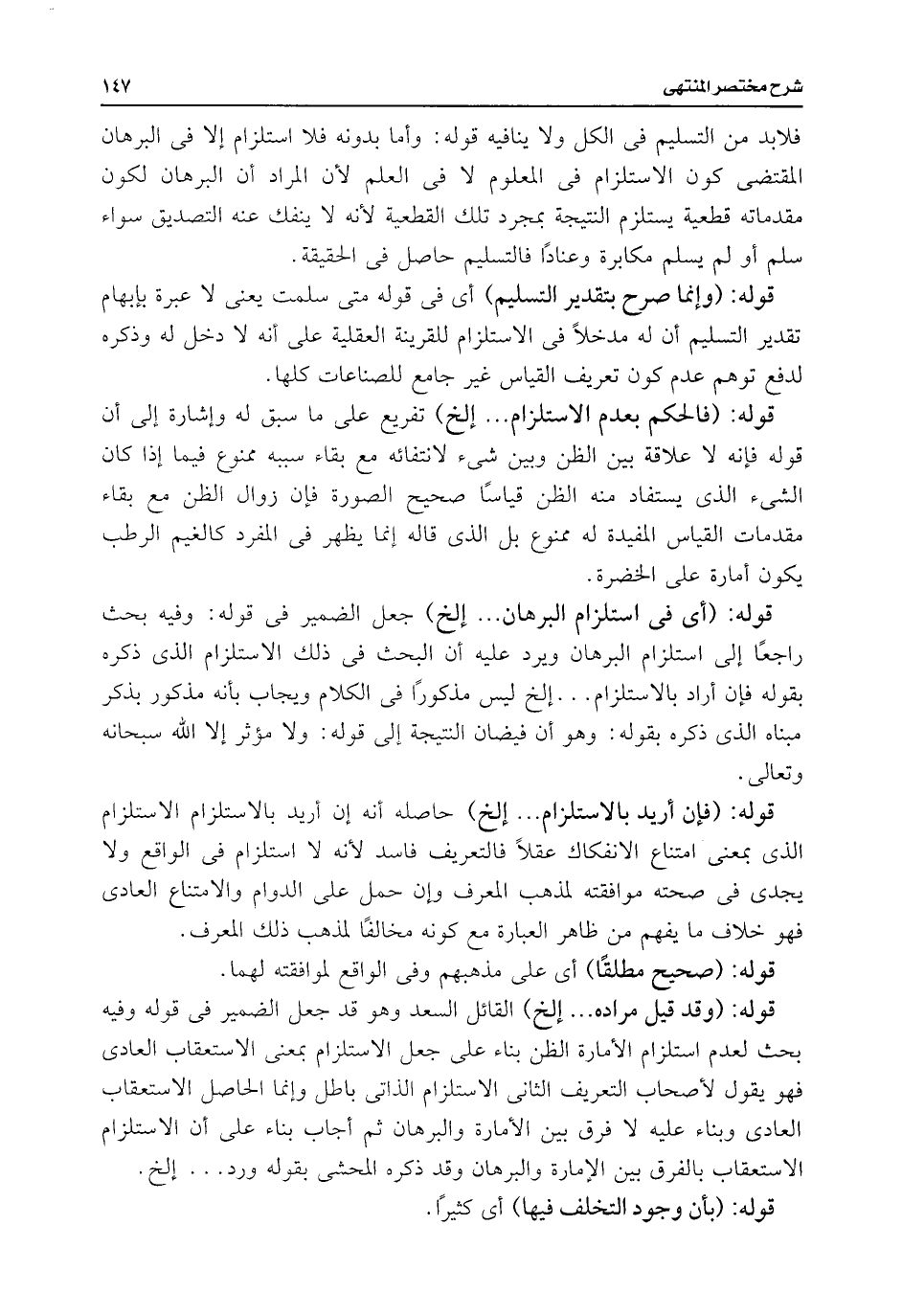فلابد من التسليم فى الكل ولا ينافيه قوله: وأما بدونه فلا استلزام إلا فى البرهان المقتضى كون الاستلزام فى المعلوم لا فى العلم لأن المراد أن البرهان لكون مقدماته قطعية يستلزم النتيجة بمجرد تلك القطعبة لأنه لا ينفك عنه التصديق سواء سلم أو لم يسلم مكابرة وعنادًا فالتسليم حاصل فى الحقيقة.