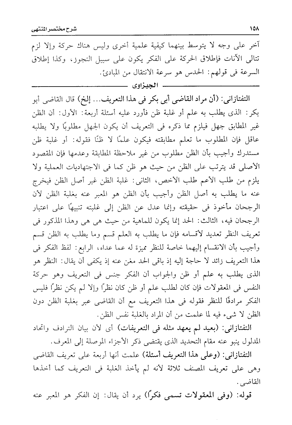 التفتازانى: (أن مراد القاضى أبى بكر فى هذا التعريف. . . إلخ) قال القاضى أبو بكر: الذى يطلب به علم أو غلبة ظن فأورد عليه أسئلة أربعة: الأول: أن الظن غير المطابق جهل فيلزم مما ذكره فى التعريف أن يكون الجهل مطلوبًا ولا يطلبه عاقل فإن المطلوب ما تعلم مطابقته فيكون علمًا لا ظنًا فقوله: أو غلبة ظن مستدرك وأجيب بأن الظن مطلوب من غير ملاحظة المطابقة وعدمها فإن المقصود الأصلى قد يترتب على الظن من حيث هو ظن كما فى الاجتهاديات العملية ولا يلزم من طلب الأعم طلب الأخص، الثانى: غلبة الظن غير أصل الظن فيخرج عنه ما يطلب به أصل الظن وأجيب بأن الظن هو المعبر عنه بغلبة الظن لأن الرجحان مأخوذ فى حقيقته وإنما عدل عن الظن إلى غلبته تنبيهًا على اعتبار الرجحان فيه، الثالث: الحد إنما يكون للماهية من حيث هى هى وهذا المذكور فى تعريف النظر تعديد لأقسامه فإن ما يطلب به العلم قسم وما يطلب به الظن قسم وأجيب بأن الانقسام إليهما خاصة للنظر مميزة له عما عداه، الرابع: لفظ الفكر فى هذا التعريف زائد لا حاجة إليه إذ باقى الحد مغن عنه إذ يكفى أن يقال: النظر هو الذى يطلب به علم أو ظن والجواب أن الفكر جنس فى التعريف وهو حركة النفس فى المعقولات فإن كان لطلب علم أو ظن كان نظرًا وإلا لم يكن نظرًا فليس الفكر مرادفًا للنظر فقوله فى هذا التعريف مع أن القاضى عبر بغلبة الظن دون الظن لا شئ فيه لما علمت من أن المراد بالغلبة نفس الظن.