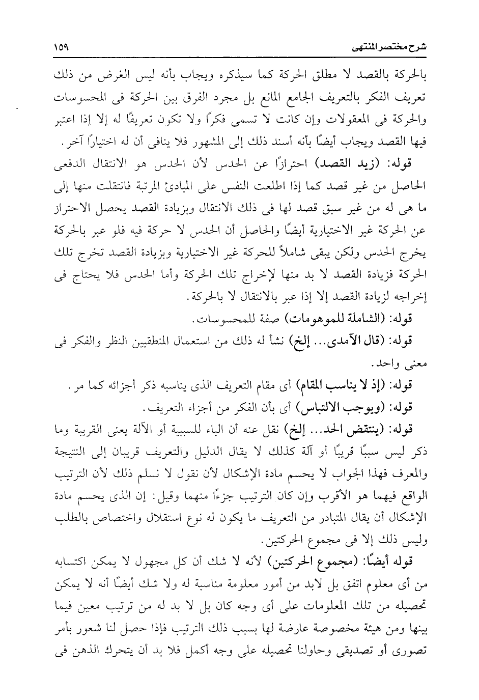 قوله أيضًا: (مجموع الحركتين) لأنه لا شك أن كل مجهول لا يمكن اكتسابه من أى معلوم اتفق بل لابد من أمور معلومة مناسبة له ولا شك أيضًا أنه لا يمكن تحصيله من تلك المعلومات على أى وجه كان بل لا بد له من ترتيب معين فيما بينها ومن هيئة مخصوصة عارضة لها بسبب ذلك الترتيب فإذا حصل لنا شعور بأمر تصوري أو تصديقى وحاولنا تحصيله على وجه أكمل فلا بد أن يتحرك الذهن فى