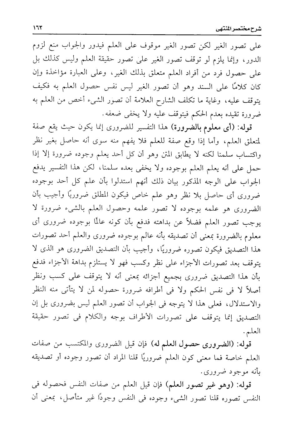 على تصور الغير لكن تصور الغير موقوف على العلم فيدور والجواب منع لزوم الدور، وإنما يلزم لو توقف تصور الغير على تصور حقيقة العلم وليس كذلك بل على حصول فرد من أفراد العلم متعلق بذلك الغير، وعلى العبارة مؤاخذة وإن كان كلامًا على السند وهو أن تصور الغير ليس نفس حصول العلم به فكيف يتوقف عليه، وغاية ما تكلف الشارح العلامة أن تصور الشئ أخص من العلم به ضرورة تقيده بعدم الحكم فيتوقف عليه ولا يخفى ضعفه.