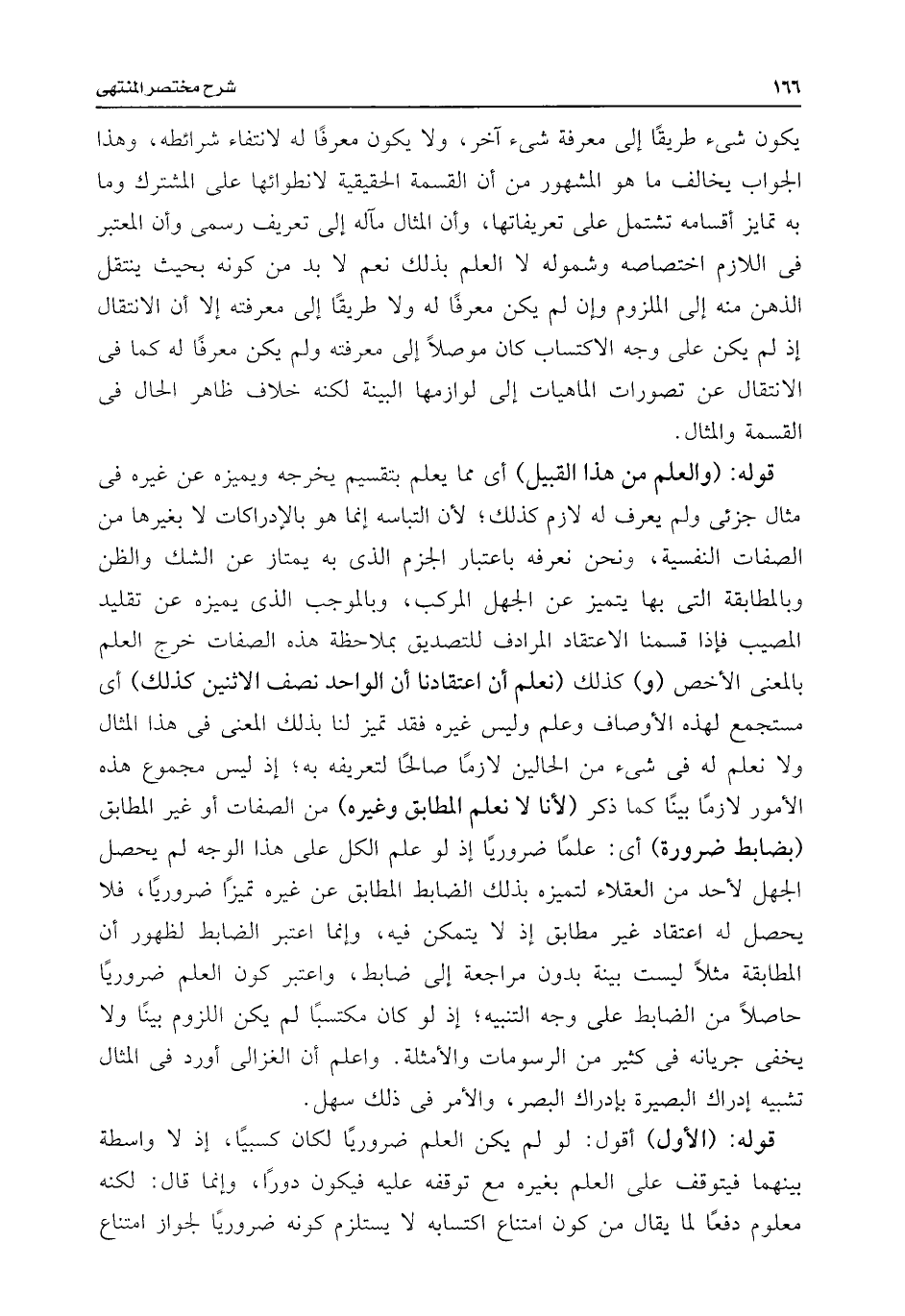 قوله: (والعلم من هذا القبيل) أى مما يعلم بتقسيم يخرجه ويميزه عن غيره فى مثال جزئى ولم يعرف له لازم كذلك؛ لأن التباسه إنما هو بالإدراكات لا بغيرها من الصفات النفسية، ونحن نعرفه باعتبار الجزم الذى به يمتاز عن الشك والظن وبالمطابقة التى بها يتميز عن الجهل المركب، وبالموجب الذى يميزه عن تقليد المصيب فإذا قسمنا الاعتقاد المرادف للتصديق بملاحظة هذه الصفات خرج العلم بالمعنى الأخص (و) كذلك (نعلم أن اعتقادنا أن الواحد نصف الاثنين كذلك) أى مستجمع لهذه الأوصاف وعلم وليس غيره فقد تميز لنا بذلك المعنى فى هذا المثال ولا نعلم له فى شئ من الحالين لازمًا صالحًا لتعريفه به؛ إذ ليس مجموع هذه الأمور لازمًا بينًا كما ذكر (لأنا لا نعلم المطابق وغيره) من الصفات أو غير المطابق (بضابط ضرورة) أى: علمًا ضروريًا إذ لو علم الكل على هذا الوجه لم يحصل الجهل لأحد من العقلاء لتميزه بذلك الضابط المطابق عن غيره تميزًا ضروريًا، فلا يحصل له اعتقاد غير مطابق إذ لا يتمكن فيه، وإنما اعتبر الضابط لظهور أن المطابقة مثلًا ليست بينة بدون مراجعة إلى ضابط، واعتبر كون العلم ضروريًا حاصلًا من الضابط على وجه التنبيه؛ إذ لو كان مكتسبًا لم يكن اللزوم بينًا ولا يخفى جريانه فى كثير من الرسومات والأمثلة. واعلم أن الغزالى أورد فى المثال تشبيه إدراك البصيرة بإدراك البصر، والأمر فى ذلك سهل.