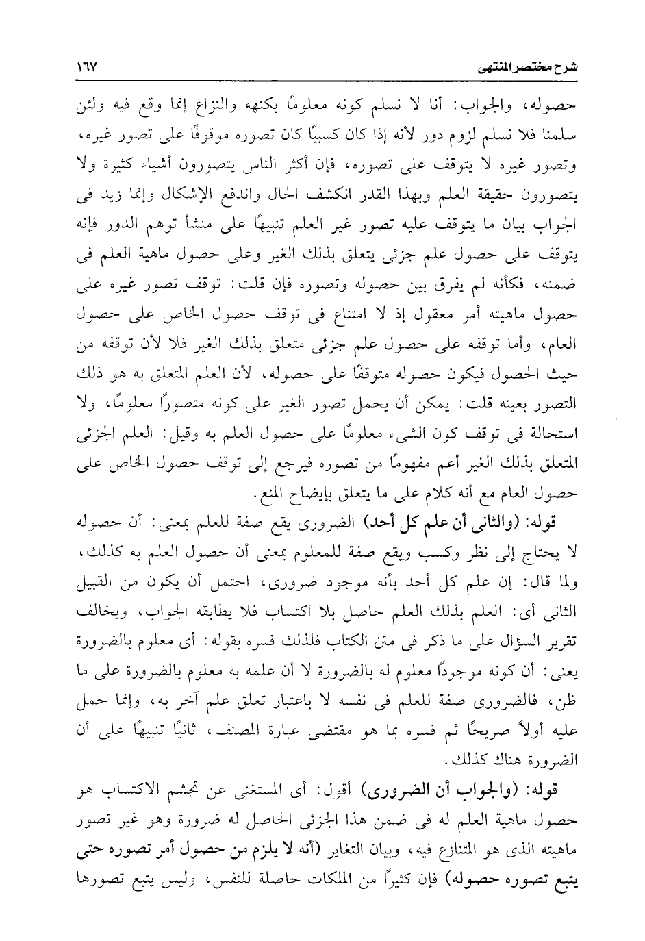 حصوله، والجواب: أنا لا نسلم كونه معلومًا بكنهه والنزاع إنما وقع فيه ولئن سلمنا فلا نسلم لزوم دور لأنه إذا كان كسبيًا كان تصوره موقوفًا على تصور غيره، وتصور غيره لا يتوقف على تصوره، فإن أكثر الناس يتصورون أشياء كثيرة ولا يتصورون حقيقة العلم وبهذا القدر انكشف الحال واندفع الإشكال وإنما زيد فى الجواب بيان ما يتوقف عليه تصور غير العلم تنبيهًا على منشأ توهم الدور فإنه يتوقف على حصول علم جزئى يتعلق بذلك الغير وعلى حصول ماهية العلم فى ضمنه، فكأنه لم يفرق بين حصوله وتصوره فإن قلت: توقف تصور غيره على حصول ماهيته أمر معقول إذ لا امتناع فى توقف حصول الخاص على حصول العام، وأما توقفه على حصول علم جزئى متعلق بذلك الغير فلا لأن توقفه من حيث الحصول فيكون حصوله متوقفًا على حصوله، لأن العلم المتعلق به هو ذلك التصور بعينه قلت: يمكن أن يحمل تصور الغير على كونه متصورًا معلومًا، ولا استحالة فى توقف كون الشئ معلومًا على حصول العلم به وقيل: العلم الجزئى المتعلق بذلك الغير أعم مفهومًا من تصوره فيرجع إلى توقف حصول الخاص على حصول العام مع أنه كلام على ما يتعلق بإيضاح المنع.