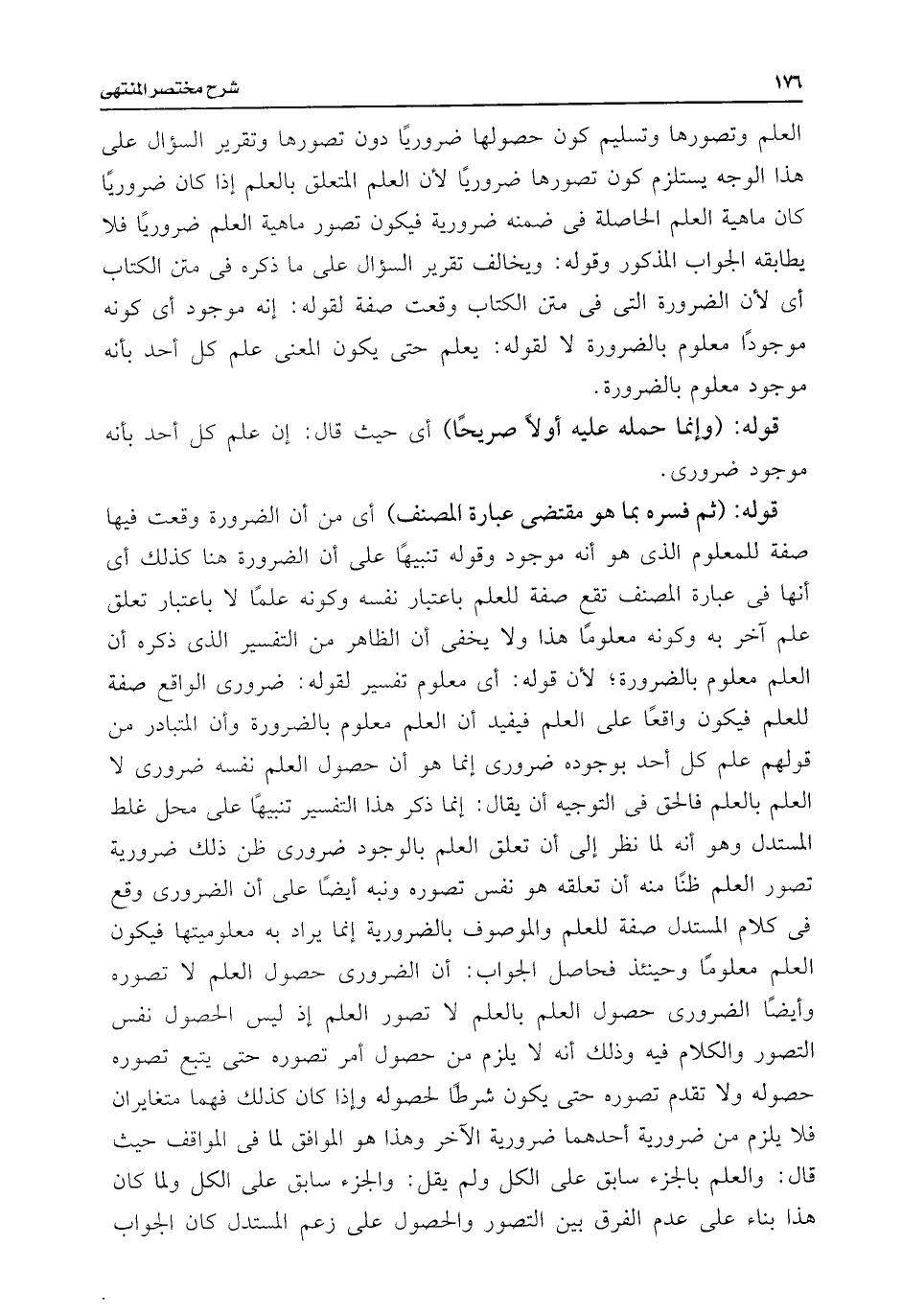العلم وتصورها وتسليم كون حصولها ضروريًا دون تصورها وتقرير السؤال على هذا الوجه يستلزم كون تصورها ضروريًا لأن العلم المتعلق بالعلم إذا كان ضروريًا كان ماهية العلم الحاصلة فى ضمنه ضرورية فيكون تصور ماهية العلم ضروريًا فلا يطابقه الجواب المذكور وقوله: ويخالف تقرير السؤال على ما ذكره فى متن الكتاب أى لأن الضرورة التى فى متن الكتاب وقعت صفة لقوله: إنه موجود أى كونه موجودًا معلوم بالضرورة لا لقوله: يعلم حتى يكون المعنى علم كل أحدى بأنه موجود معلوم بالضرورة.