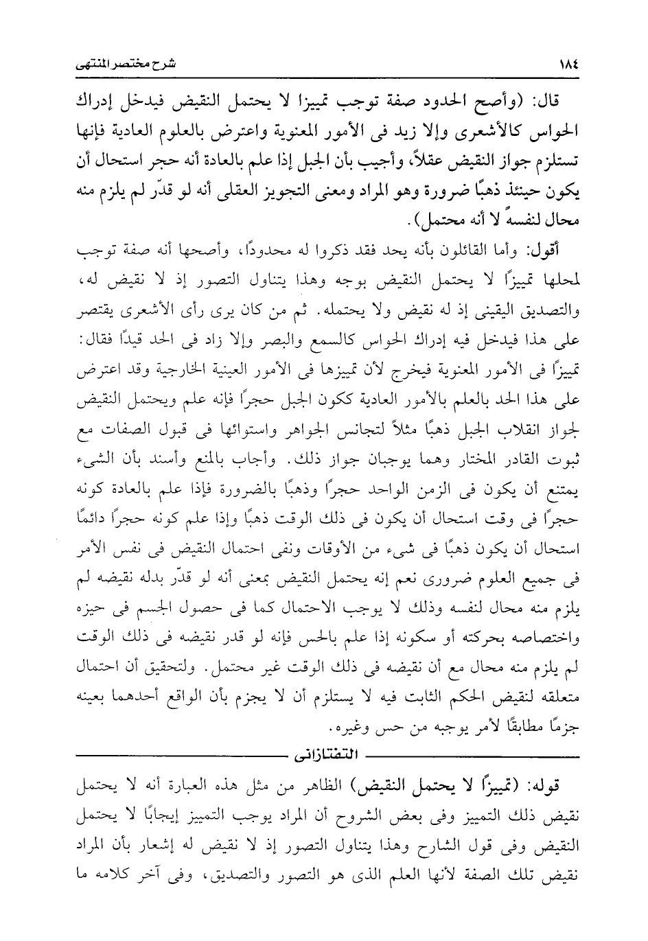 أقول: وأما القائلون بأنه يحد فقد ذكروا له محدودًا، وأصحها أنه صفة توجب لمحلها تمييزًا لا يحتمل النقيض بوجه وهذا يتناول التصور إذ لا نقيض له، والتصديق اليقينى إذ له نقيض ولا يحتمله. ثم من كان يرى رأى الأشعرى يقتصر على هذا فيدخل فيه إدراك الحواس كالسمع والبصر وإلا زاد فى الحد قيدًا فقال: تمييزًا فى الأمور المعنوية فيخرج لأن تمييزها فى الأمور العينية الخارجية وقد اعترض على هذا الحد بالعلم بالأمور العادية ككون الجبل حجرًا فإنه علم ويحتمل النقيض لجواز انقلاب الجبل ذهبًا مثلًا لتجانس الجواهر واستوائها فى قبول الصفات مع ثبوت القادر المختار وهما يوجبان جواز ذلك. وأجاب بالمنع وأسند بأن الشئ يمتنع أن يكون فى الزمن الواحد حجرًا وذهبًا بالضرورة فإذا علم بالعادة كونه حجرًا فى وقت استحال أن يكون فى ذلك الوقت ذهبًا وإذا علم كونه حجرًا دائمًا استحال أن يكون ذهبًا فى شئ من الأوقات ونفى احتمال النقيض فى نفس الأمر فى جميع العلوم ضرورى نعم إنه يحتمل النقيض بمعنى أنه لو قدّر بدله نقيضه لم يلزم منه محال لنفسه وذلك لا يوجب الاحتمال كما فى حصول الجسم فى حيزه واختصاصه بحركته أو سكونه إذا علم بالحس فإنه لو قدر نقيضه فى ذلك الوقت لم يلزم منه محال مع أن نقيضه فى ذلك الوقت غير محتمل. ولتحقيق أن احتمال متعلقه لنقيض الحكم الثابت فيه لا يستلزم أن لا يجزم بأن الواقع أحدهما بعينه جزمًا مطابقًا لأمر يوجبه من حس وغيره.