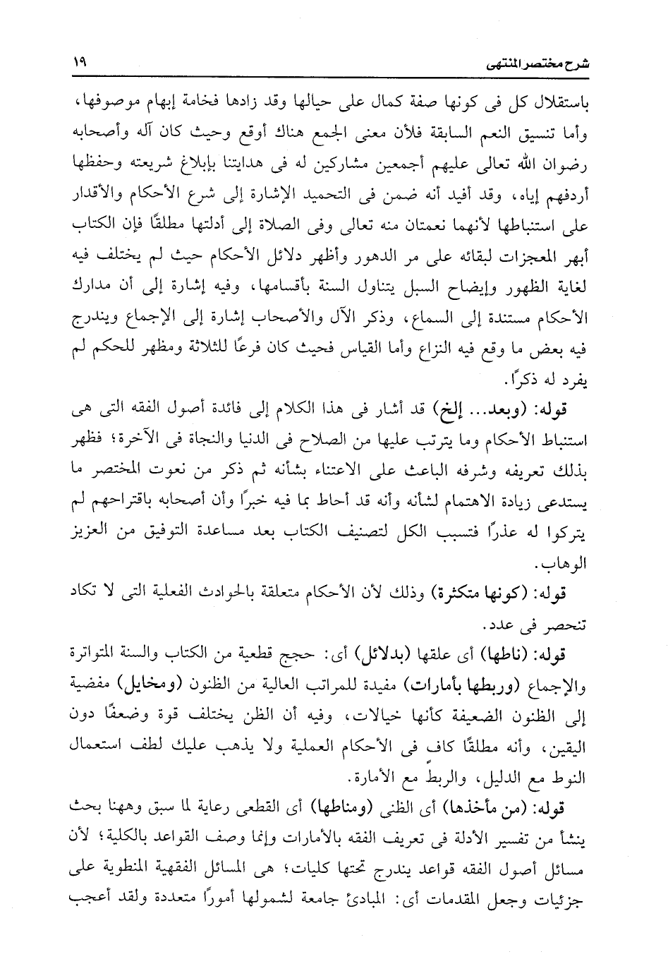 باستقلال كل فى كونها صفة كمال على حيالها وقد زادها فخامة إبهام موصوفها، وأما تنسيق النعم السابقة فلأن معنى الجمع هناك أوقع وحيث كان آله وأصحابه رضوان اللَّه تعالى عليهم أجمعين مشاركين له فى هدايتنا بإبلاغ شريعته وحفظها أردفهم إياه، وقد أفيد أنه ضمن فى التحميد الإشارة إلى شرع الأحكام والأقدار على استنباطها لأنهما نعمتان منه تعالى وفى الصلاة إلى أدلتها مطلقًا فإن الكتاب أبهر المعجزات لبقائه على مر الدهور وأظهر دلائل الأحكام حيث لم يختلف فيه لغاية الظهور وإيضاح السبل يتناول السنة بأقسامها، وفيه إشارة إلى أن مدارك الأحكام مستندة إلى السماع، وذكر الآل والأصحاب إشارة إلى الإجماع ويندرج فيه بعض ما وقع فيه النزاع وأما القياس فحيث كان فرعًا للثلاثة ومظهر للحكم لم يفرد له ذكرًا.