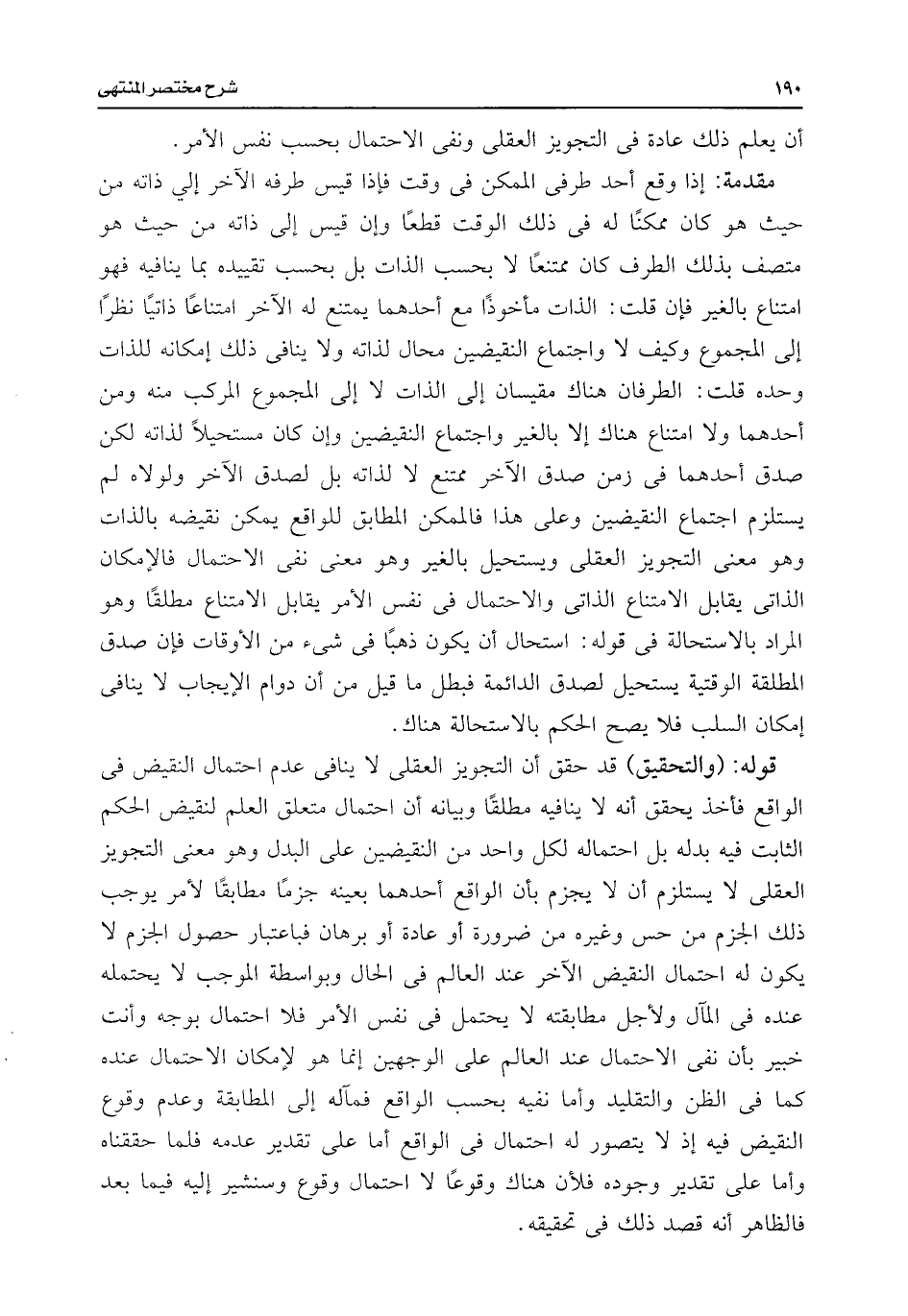 مقدمة: إذا وقع أحد طرفى الممكن فى وقت فإذا قيس طرفه الآخر إلى ذاته من حيث هو كان ممكنًا له فى ذلك الوقت قطعًا وإن قيس إلى ذاته من حيث هو متصف بذلك الطرف كان ممتنعًا لا بحسب الذات بل بحسب تقييده بما ينافيه فهو امتناع بالغير فإن قلت: الذات مأخوذًا مع أحدهما يمتنع له الآخر امتناعًا ذاتيًا نظرًا إلى المجموع وكيف لا واجتماع النقيضين محال لذاته ولا ينافى ذلك إمكانه للذات وحده قلت: الطرفان هناك مقيسان إلى الذات لا إلى المجموع المركب منه ومن أحدهما ولا امتناع هناك إلا بالغير واجتماع النقيضين وإن كان مستحيلًا لذاته لكن صدق أحدهما فى زمن صدق الآخر ممتنع لا لذاته بل لصدق الآخر ولولاه لم يستلزم اجتماع النقيضين وعلى هذا فالممكن المطابق للواقع يمكن نقيضه بالذات وهو معنى التجويز العقلى ويستحيل بالغير وهو معنى نفى الاحتمال فالإمكان الذاتى يقابل الامتناع الذاتى والاحتمال فى نفس الأمر يقابل الامتناع مطلقًا وهو المراد بالاستحالة فى قوله: استحال أن يكون ذهبًا فى شئ من الأوقات فإن صدق المطلقة الوقتية يستحيل لصدق الدائمة فبطل ما قيل من أن دوام الإيجاب لا ينافى إمكان السلب فلا يصح الحكم بالاستحالة هناك.