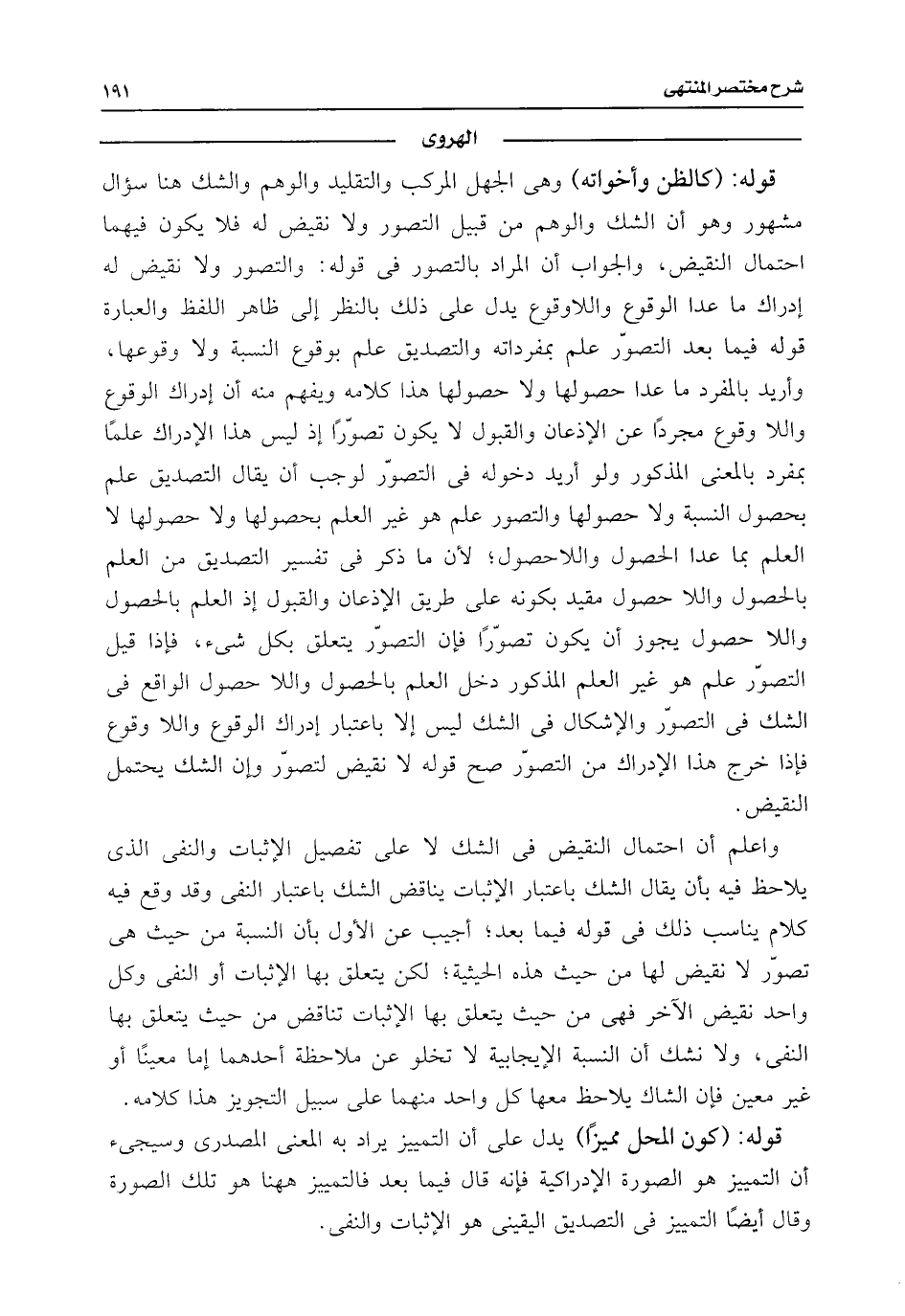 واعلم أن احتمال النقيض فى الشك لا على تفصيل الإثبات والنفى الذى يلاحظ فيه بأن يقال الشك باعتبار الإثبات يناقض الشك باعتبار النفى وقد وقع فيه كلام يناسب ذلك فى قوله فيما بعد؛ أجيب عن الأول بأن النسبة من حيث هى تصوّر لا نقيض لها من حيث هذه الحيثية؛ لكن يتعلق بها الإثبات أو النفى وكل واحد نقيض الآخر فهى من حيث يتعلق بها الإثبات تناقض من حيث يتعلق بها النفى، ولا نشك أن النسبة الإيجابية لا تخلو عن ملاحظة أحدهما إما معينًا أو غير معين فإن الشاك يلاحظ معها كل واحد منهما على سبيل التجويز هذا كلامه.