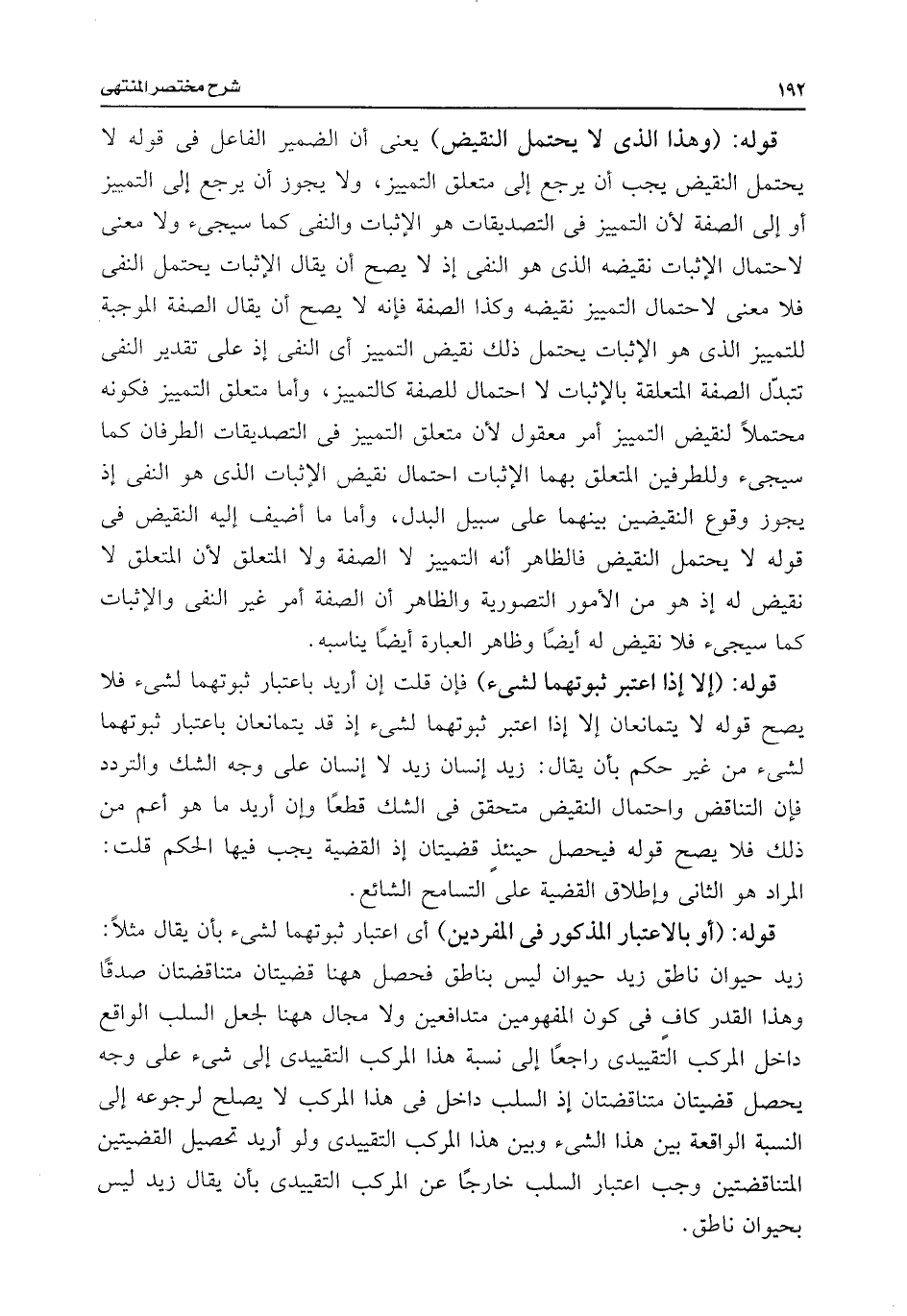 قوله: (أو بالاعتبار المذكور فى المفردين) أى اعتبار ثبوتهما لشئ بأن يقال مثلًا: زيد حيوان ناطق زيد حيوان ليس بناطق فحصل ههنا قضيتان متناقضتان صدقًا وهذا القدر كافٍ فى كون المفهومين متدافعين ولا مجال ههنا لجعل السلب الواقع داخل المركب التقييدى راجعًا إلى نسبة هذا المركب التقييدى إلى شئ على وجه يحصل قضيتان متناقضتان إذ السلب داخل فى هذا المركب لا يصلح لرجوعه إلى النسبة الواقعة بين هذا الشئ وبين هذا المركب التقييدى ولو أريد تحصيل القضيتين المتناقضتين وجب اعتبار السلب خارجًا عن المركب التقييدى بأن يقال زيد ليس بحيوان ناطق.