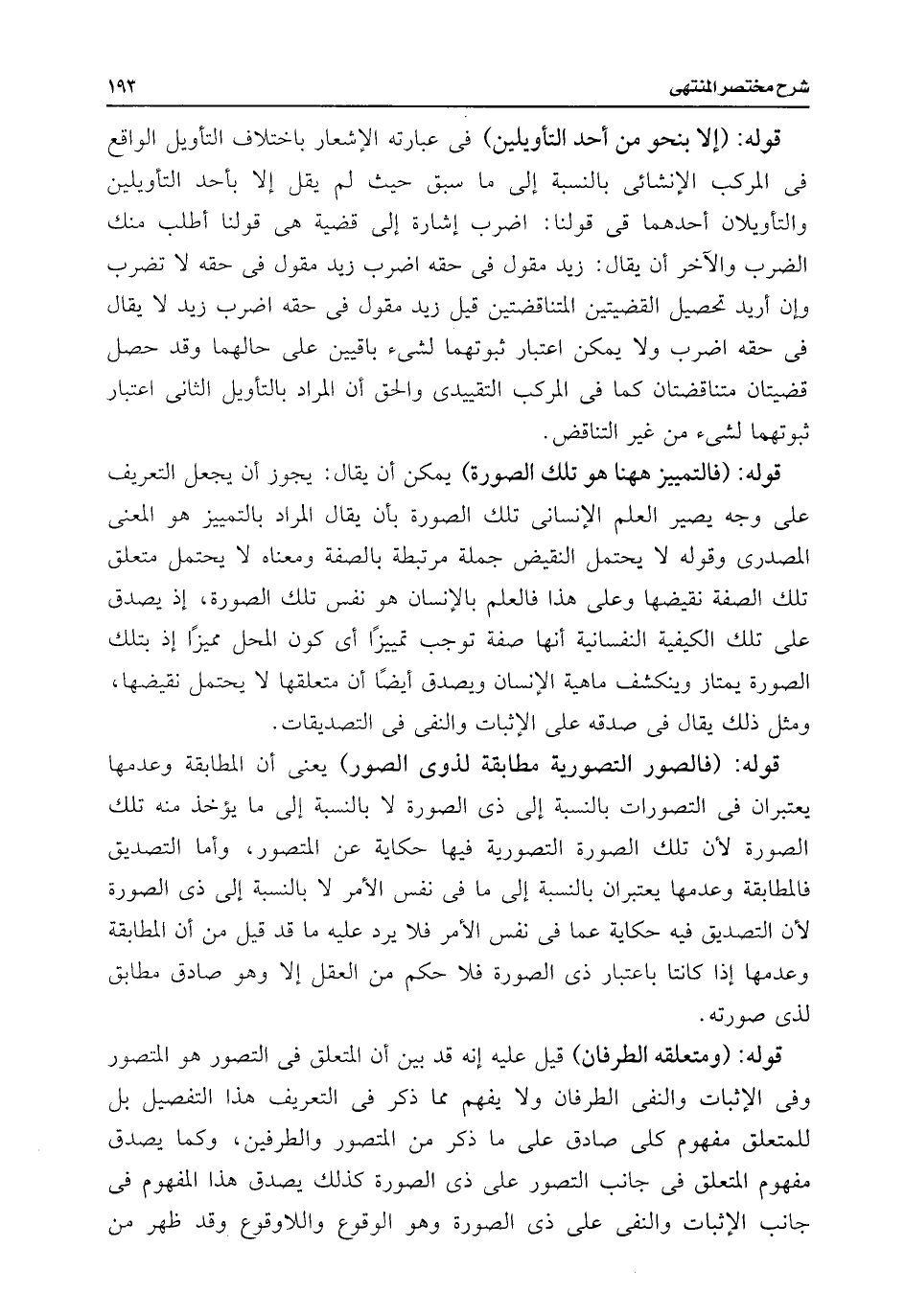 قوله: (ومتعلقه الطرفان) قيل عليه إنه قد بين أن المتعلق فى التصور هو المتصور وفى الإثبات والنفى الطرفان ولا يفهم مما ذكر فى التعريف هذا التفصيل بل للمتعلق مفهوم كلى صادق على ما ذكر من المتصور والطرفين، وكما يصدق مفهوم المتعلق فى جانب التصور على ذى الصورة كذلك يصدق هذا المفهوم فى جانب الإثبات والنفى على ذى الصورة وهو الوقوع واللاوقوع وقد ظهر من