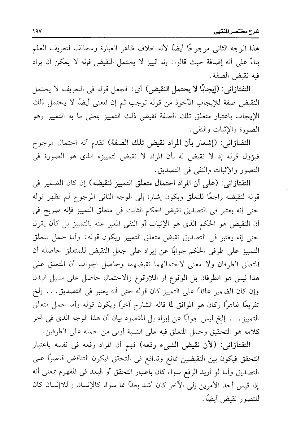 التفتازانى: (إيجابًا لا يحتمل النقيض) أى: فجعل قوله فى التعريف لا يحتمل النقيض صفة للإيجاب المأخوذ من قوله توجب ثم إن المعنى أيضًا لا يحتمل ذلك الإيجاب باعتبار متعلق تلك الصفة نقيض ذلك التمييز بمعنى ما به التمييز وهو الصورة والإثبات والنفى.