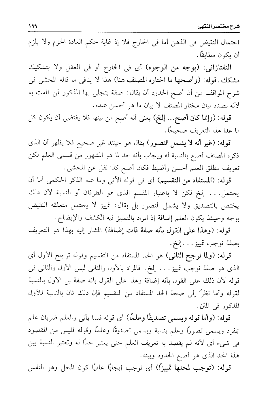 قوله: (وأما قوله ويسمى تصديقًا وعلمًا) أى قوله فيما يأتى والعلم ضربان علم بمفرد ويسمى تصورًا وعلم بنسبة ويسمى تصديقًا وعلمًا وقوله فليس من المقصود فى شئ أى لأنه لم يقصد به تعريف العلم حتى يعتبر حدًا له وتعتبر النسبة بين هذا الحد الذى هو أصح الحدود وبينه.
