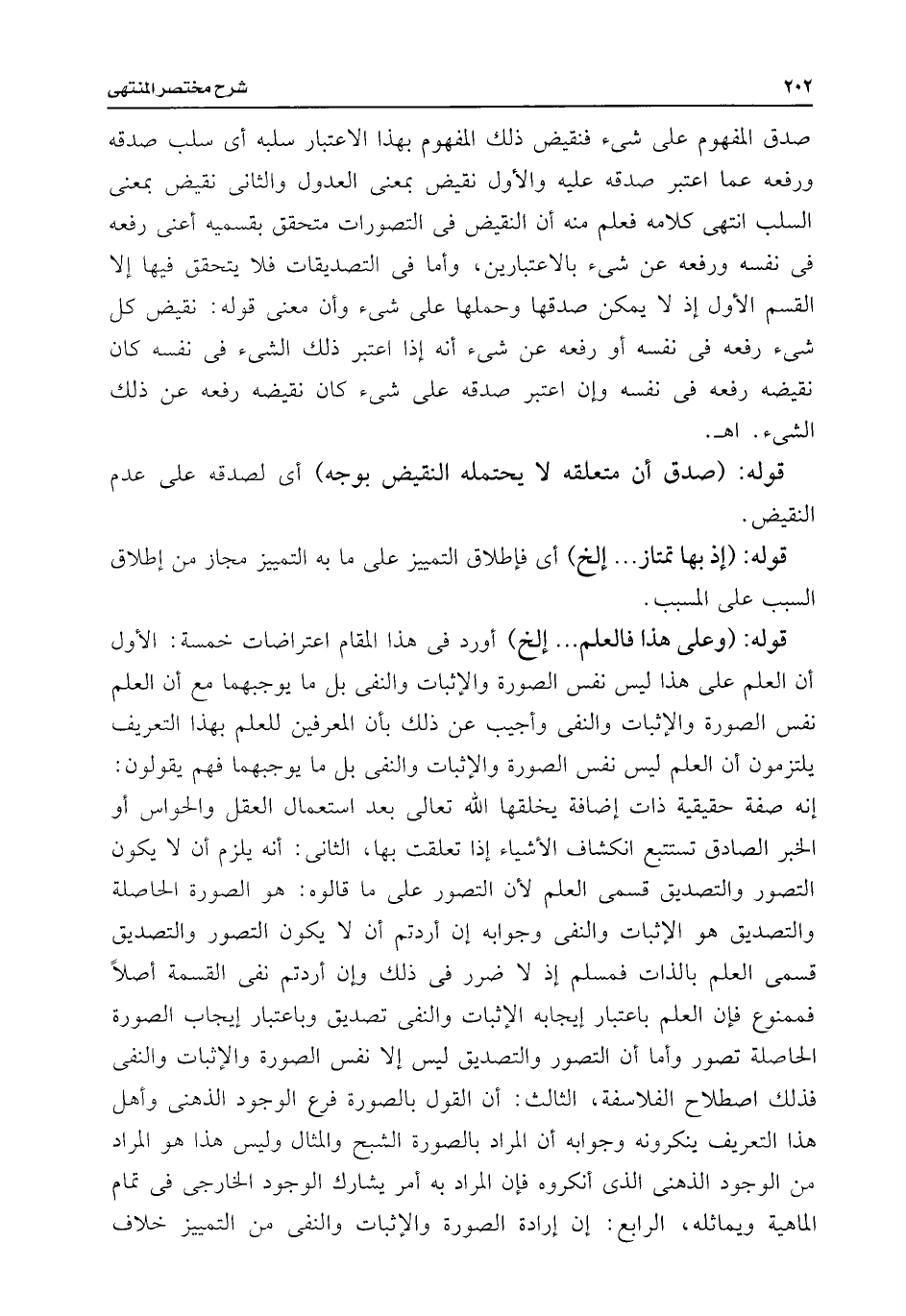 صدق المفهوم على شئ فنقيض ذلك المفهوم بهذا الاعتبار سلبه أى سلب صدقه ورفعه عما اعتبر صدقه عليه والأول نقيض بمعنى العدول والثانى نقيض بمعنى السلب انتهى كلامه فعلم منه أن النقيض فى التصورات متحقق بقسميه أعنى رفعه فى نفسه ورفعه عن شئ بالاعتبارين، وأما فى التصديقات فلا يتحقق فيها إلا القسم الأول إذ لا يمكن صدقها وحملها على شئ وأن معنى قوله: نقيض كل شئ رفعه فى نفسه أو رفعه عن شئ أنه إذا اعتبر ذلك الشئ فى نفسه كان نقيضه رفعه فى نفسه وإن اعتبر صدقه على شئ كان نقيضه رفعه عن ذلك الشئ. اهـ.
